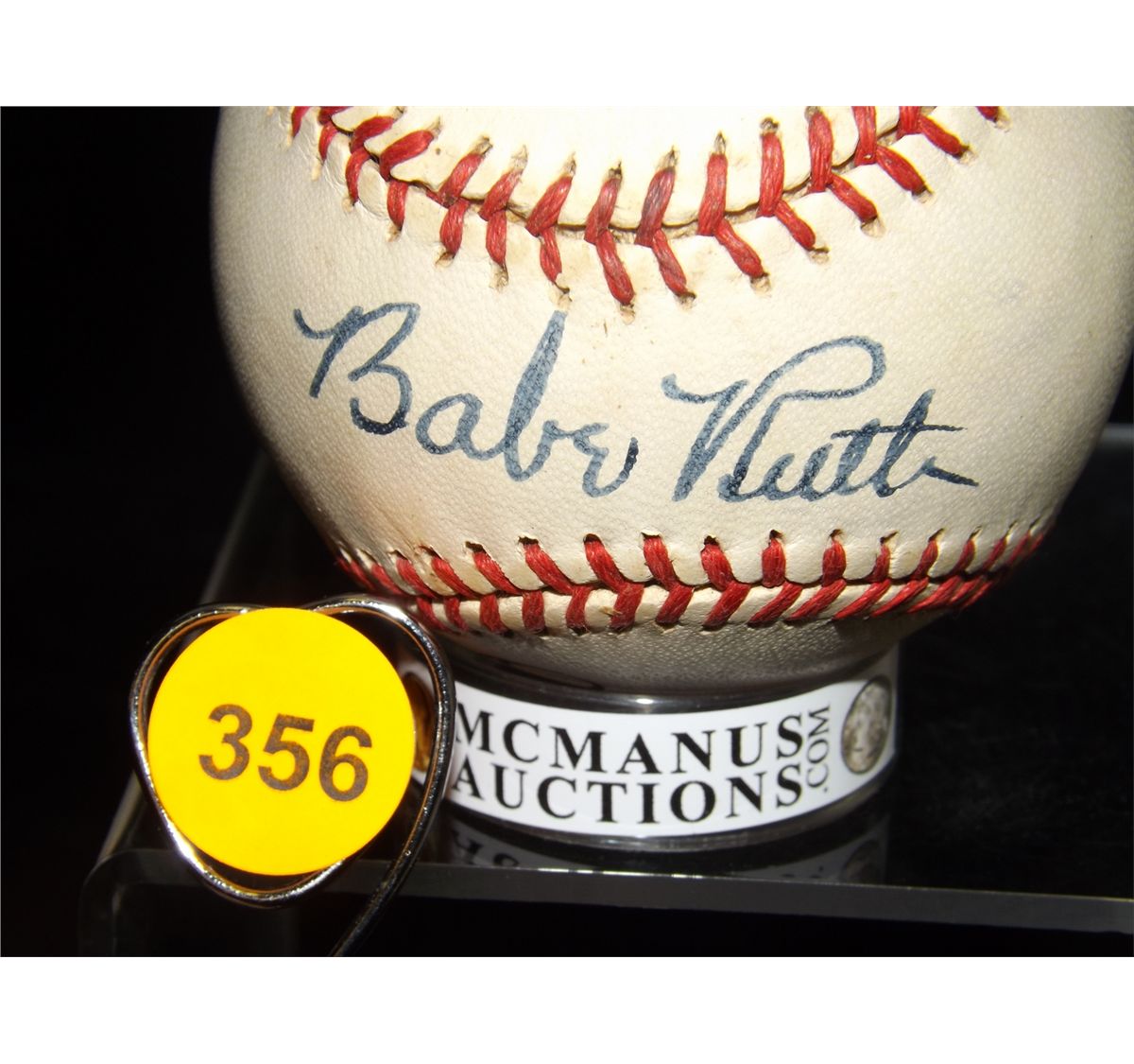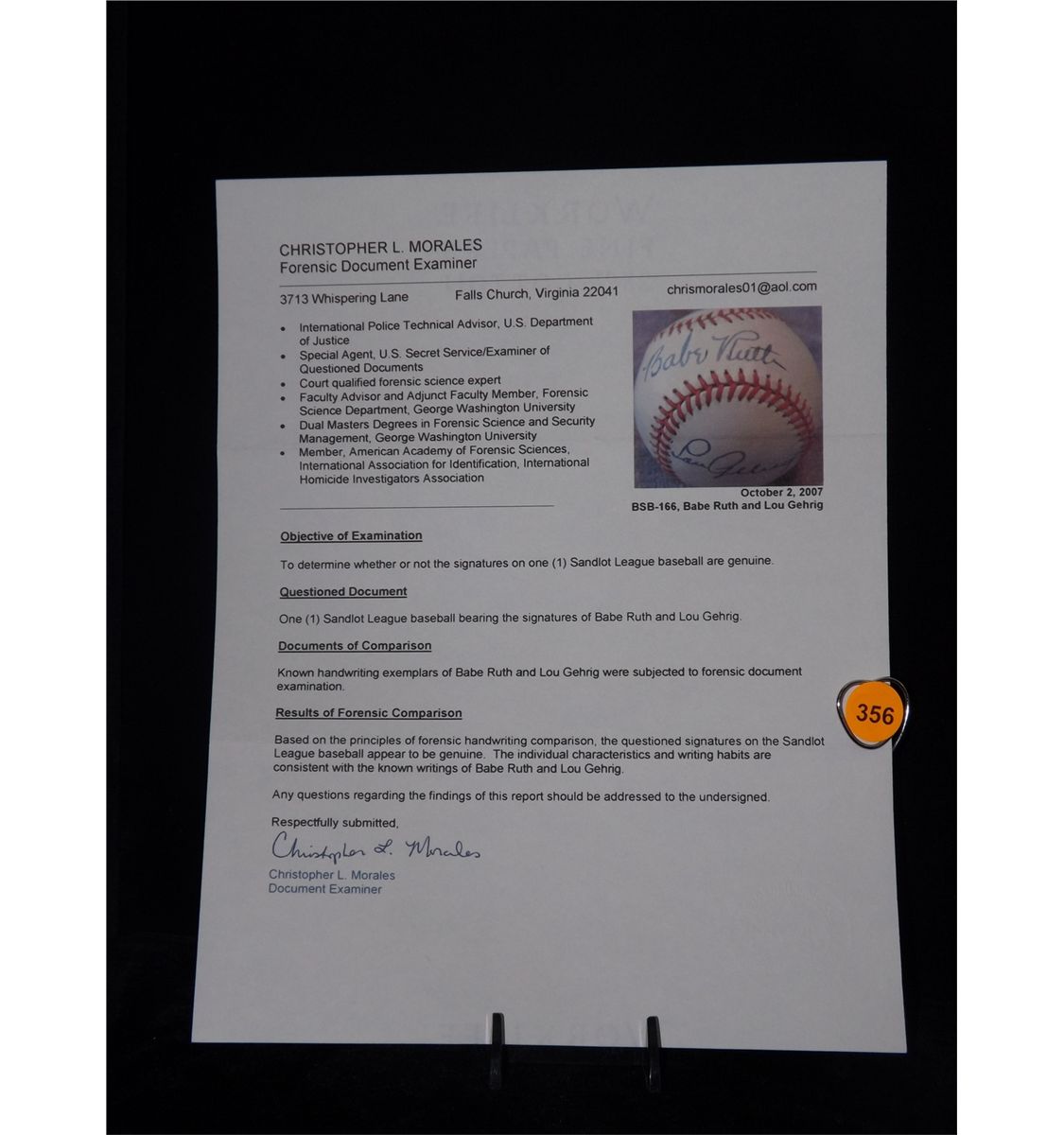 Babe Ruth and Lou Gehrig Autographed Baseball. Sandlot League Ball Autographed by Ruth and Gehrig. Appraised or estimated retail value $20,000. COA by Christopher Morales. All Sales Final. Please see terms and conditions of auction.