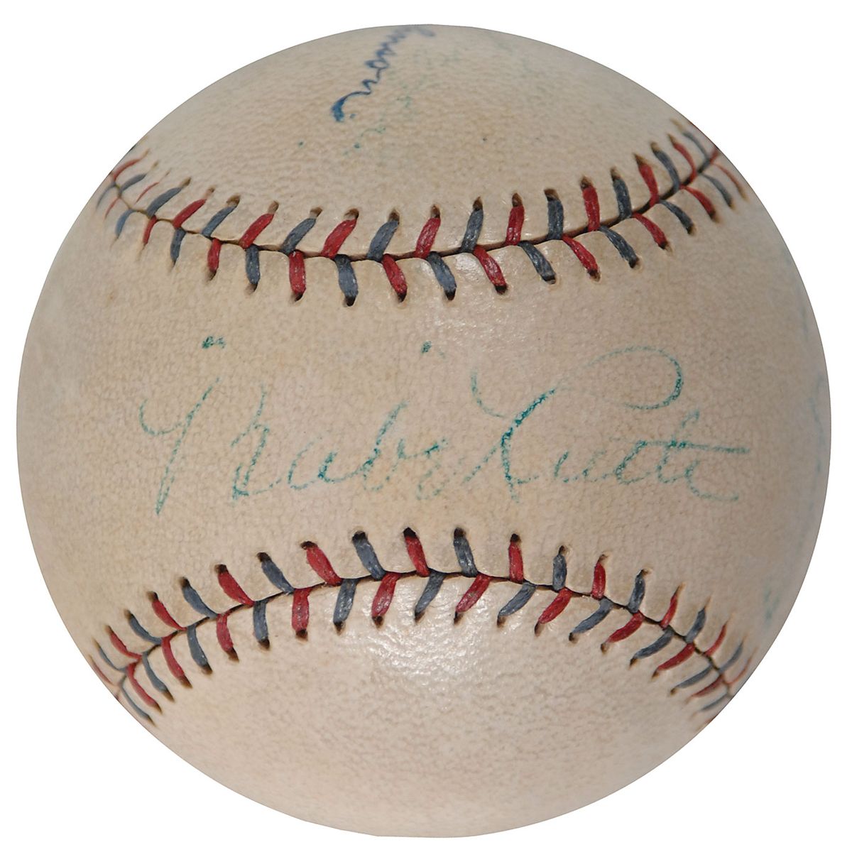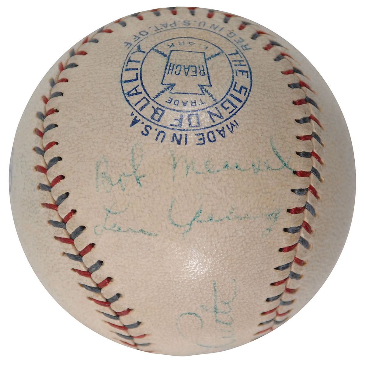 Official Reach American League (Ban Johnson) baseball signed in blue ink on the sweet spot by Babe Ruth and two side panels by Lou Gehrig, Bob Meusel, and Tony Lazzeri. The signatures are light but legible, with the Lazzeri extremely light but visible above the Ban Johnson stamp, otherwise fine condition. The baseball bears exceptionally bold stampings and is especially bright for its age. A superb example that features the powerful portion of the 1927 Yankees legendary ‘Murderer’s Row’ lineup, the season in which Ruth hit 60 home runs. This baseball can be definitively dated to this fabled year, as 1927 was the only year that the official American League baseball was adorned with these specific stamps and patent markings—and it was not signed later, as Ruth discontinued using quotation marks around his first name the following year. A simply exquisite piece from what is widely considered the greatest team in baseball history.