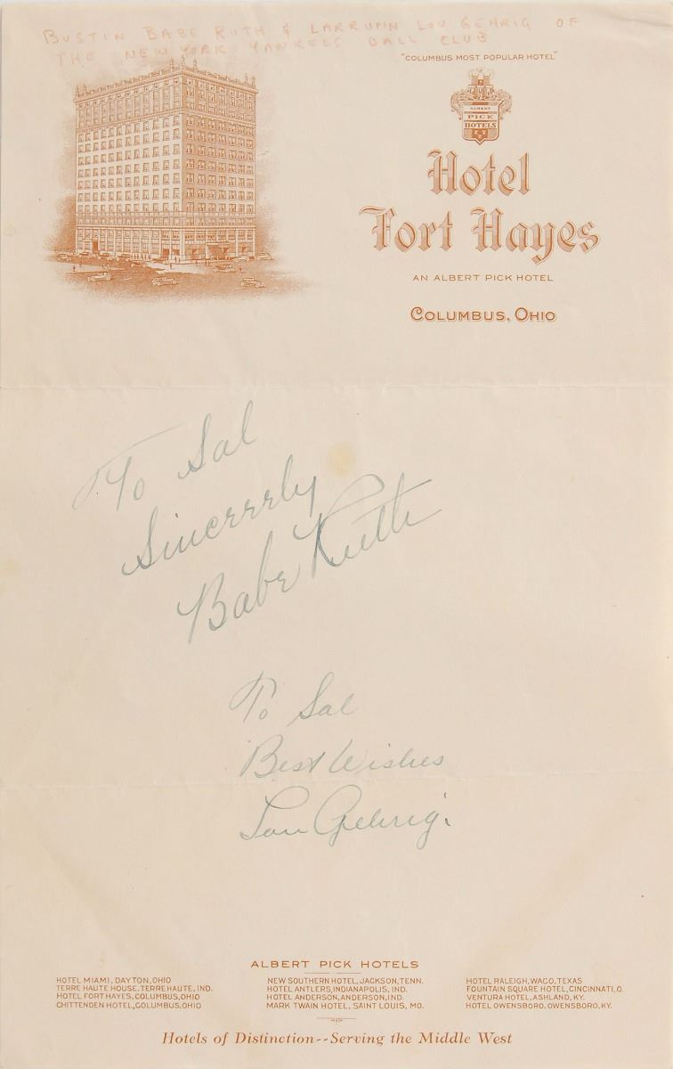 Vintage fountain pen signatures and inscriptions, “To Sal, Sincerely, Babe Ruth” and “To Sal, Best Wishes, Lou Gehrig,” on an off-white 6 x 9.5 sheet of Hotel Fort Hayes letterhead. In fine condition, with a light stain above Ruth’s signature and two faint envelope-related stains beneath Gehrig’s. A choice pairing of these coveted signatures.