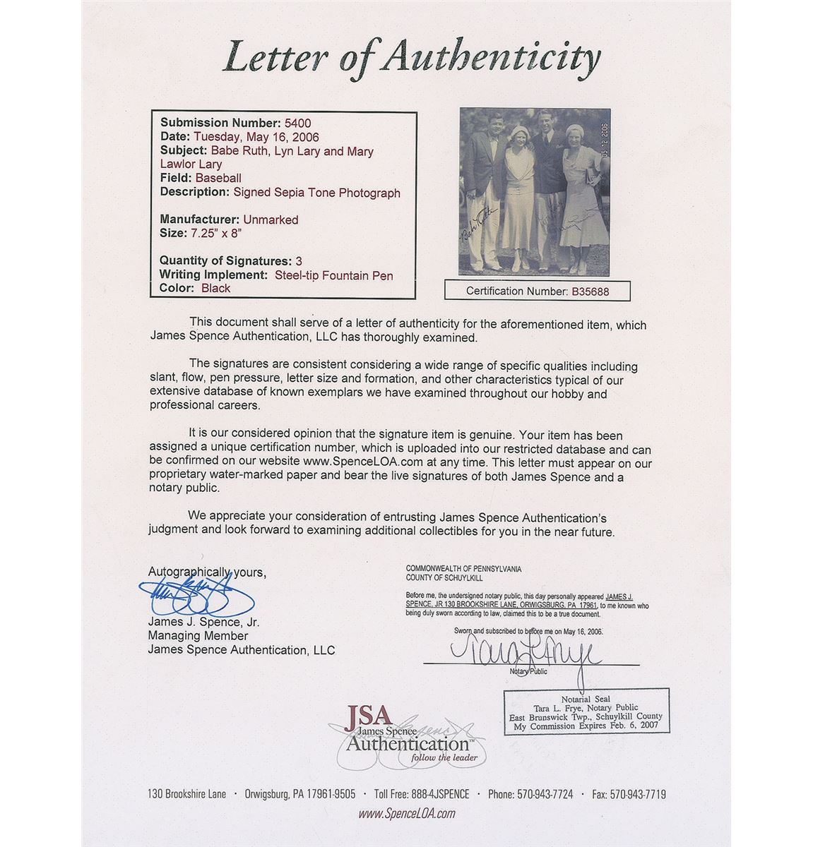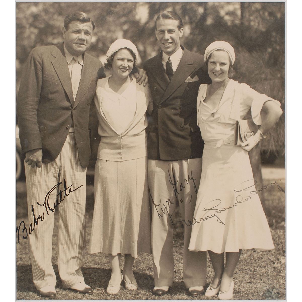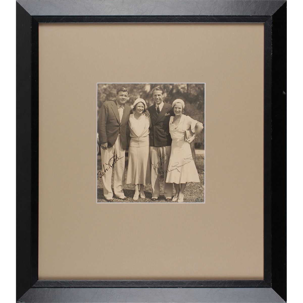 Wonderful matte-finish 7 x 7.75 photo of Ruth with his wife Claire, teammate Lyn Lary, and his wife, actress Mary Lawlor, boldly signed in fountain pen, “Babe Ruth,” “Lyn Lary,” and “Mary Lawlor Lary.” Matted and framed to an overall size of 17.5 x 19.5. In fine condition. Accompanied by a full letter of authenticity from JSA. This signed photo presents several wonderful associations. Lyn Lary played shortstop for the Yankees between 1929 and 1934, Ruth’s last years with the club. The two became good friends and Ruth nicknamed him ‘Broadway’ because he loved the theater in New York and was one of the best-dressed ballplayers in the league—as is evident in this photograph. Even more interesting is Mary Lawlor, who was one of the original cast members of the musical No, No, Nanette, infamously produced by Boston Red Sox owner Harry Frazee. In the lore of the ‘Curse of the Bambino,’ Frazee sold Babe Ruth from the Red Sox to the Yankees in order to finance the show, resulting in the franchise’s decades-long World Series drought. A remarkable combination of Ruthian myth embodied in a single, boldly signed photo.