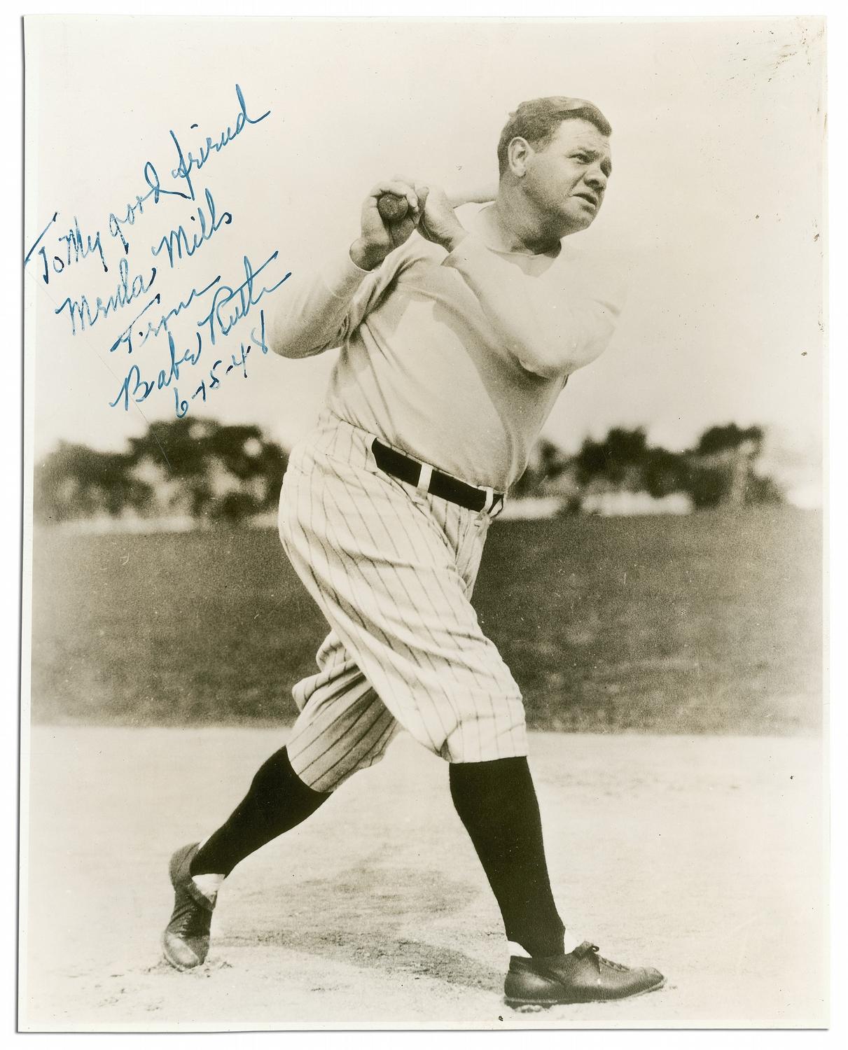 Vintage glossy 7.5 x 9.25 photo of Ruth taking a practice swing in his Yankee pinstripe pants, signed and inscribed in fountain pen “To my good friend Merla Mills from Babe Ruth, 6-15-48.” In very good to fine condition, with lightly trimmed edges, some slight irregular adhesion to inscription, mounting remnants to reverse, intersecting horizontal and vertical crease to bottom portion of image, and a few light surface marks and creases.