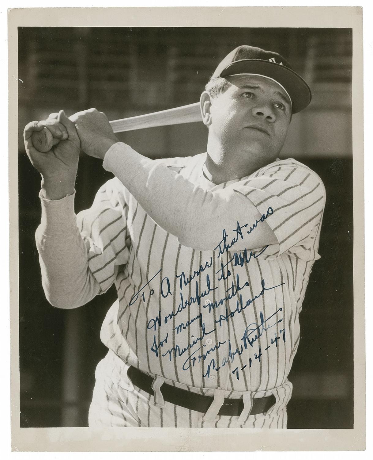 Vintage glossy 8 x 10 photo of Ruth taking a practice swing while clad in his Yankee pinstripes, signed and inscribed in fountain pen “To a Nurse that was wonderful to me for many months, Muriel Holland, from Babe Ruth 7-14-47.” Scattered creases, surface marks, and impressions, and some light irregular ink adhesion to a few letters of Ruth’s signature, otherwise very good condition. Holland was Ruth’s personal nurse from January to July of 1947. A touching inscription from the ‘Sultan of Swat’ a little more than a year before succumbing to cancer. Accompanied by a full letter of authenticity from PSA/DNA.