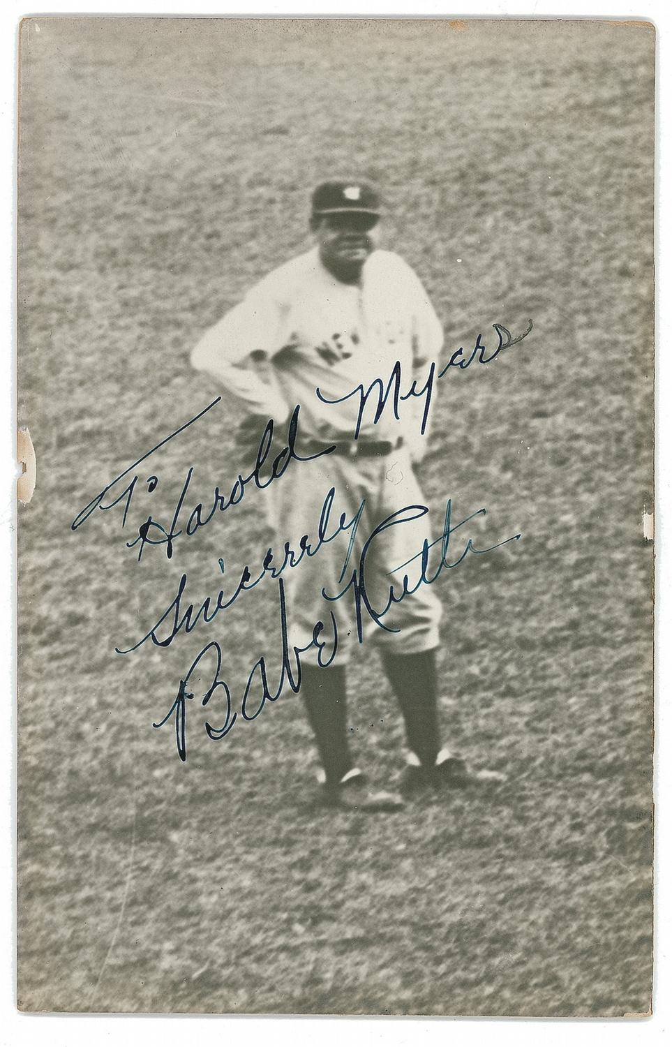 Vintage matte-finish 3.5 x 5.5 photo of an older Ruth, in his Yankees road uniform, apparently standing in the outfield, signed and inscribed in fountain pen “To Harold Myers, Sincerely, Babe Ruth.” In very good condition, with a few mild ripples, image a bit blurry, a very thin strip of adhesive along left edge, and a small chip and surface loss to left edge as well. Accompanied by an identical size backing, notated in an unknown hand, “Taken at St. Louis, June 24, 1933.” Records indicate the Yankees were in the midst of a five game series against the St. Louis Browns at Sportsman’s Park. Two weeks later, Ruth would hit the first home run in All Star Game history. An uncommon pose with a crisp and prominent signature.
