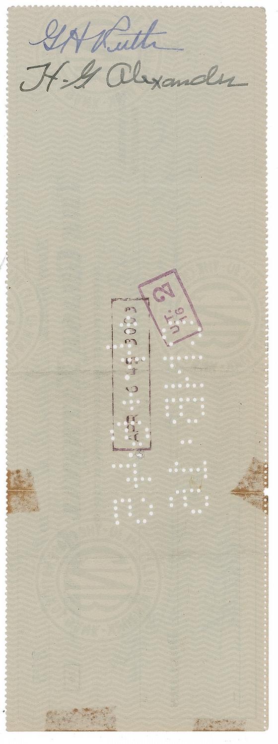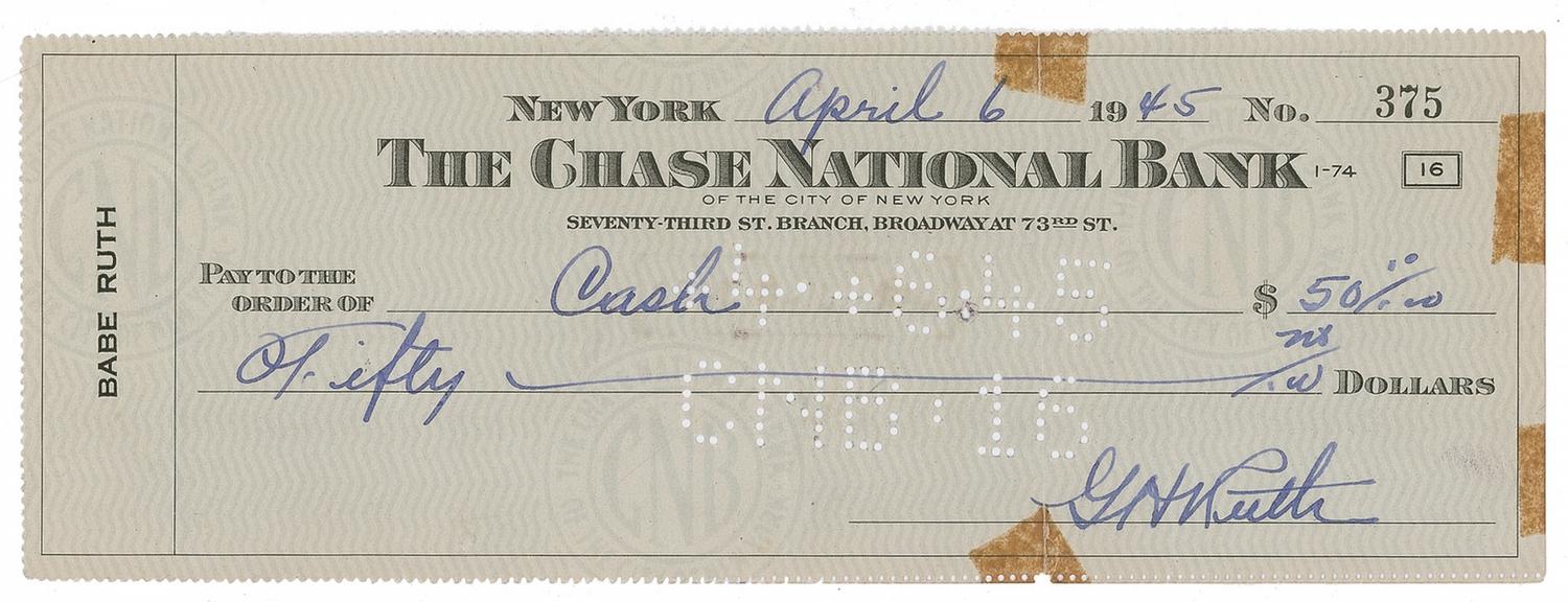 Personal check, 8.5 x 3, filled out and signed by Ruth, “G. H. Ruth,” payable to Cash for $50.00, April 6, 1945. Check is also endorsed on the reverse, “G. H. Ruth.” In very good to fine condition, with two vertical creases, one to left of signature, some old tape toning to edges, one approaching beginning of signature, and expected cancellation stamps and holes to body. A boldly penned example whose double signature lends to its scarcity as many of the endorsements were clipped off the checks to make separate signatures.