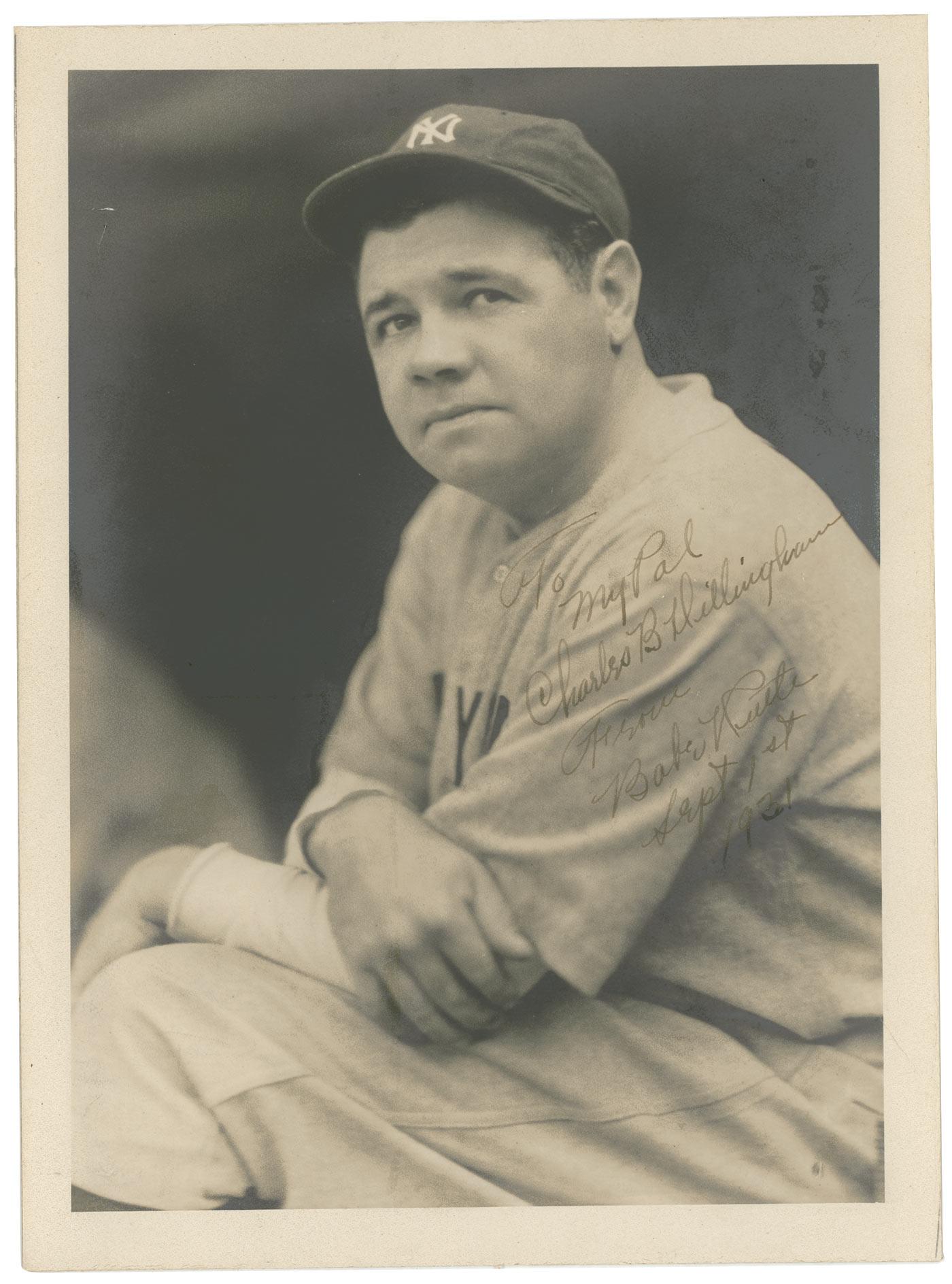Vintage matte-finish 8 x 11 photo of Ruth posing in his Yankees road uniform, believed to be the work of noted Chicago photographer George Burke, signed and inscribed in fountain pen “To my pal Charles B. Dillingham from Babe Ruth, Sept. 1, 1931.” Photo is mounted to an identical size cardboard backing. In very good condition, with a few scattered light surface marks and creases, a few thin mild stains, light contrast to signature, and moderate silvering to darker areas of image and background. Accompanied by a full letter of authenticity from PSA/DNA, as well as a letter of authenticity from James Spence. Ruth’s Yankees dropped a double header to the Red Sox on the date he signed this photo. A fine image of baseball’s most iconic figure.