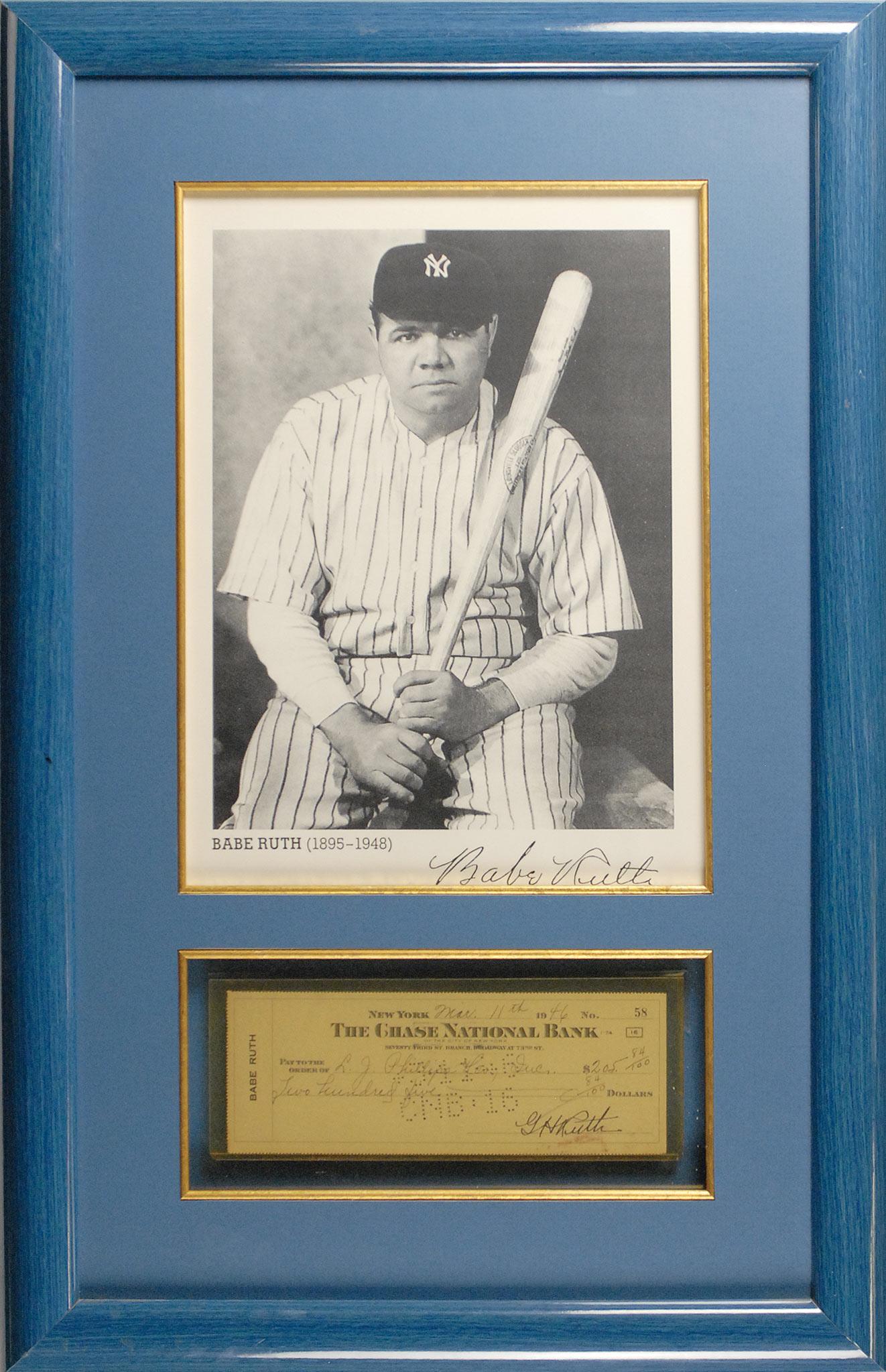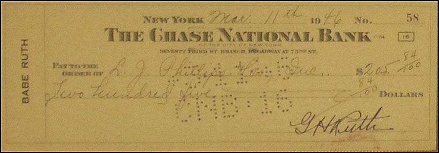 Personal check, 8.5 x 3, filled out in another hand and signed by Ruth, “G. H. Ruth,” payable to L. J. Phillips Co., Inc. for $205.84, March 11, 1946. Double-matted with an oversized photo of Ruth and framed to an overall size of 17.5 x 27. In fine condition, with expected cancellation holes and stamps, an office pencil mark lightly touching the first letter of signature, and show-through from an ink stamping on the reverse approaching the bottom of his name. A bold signature!