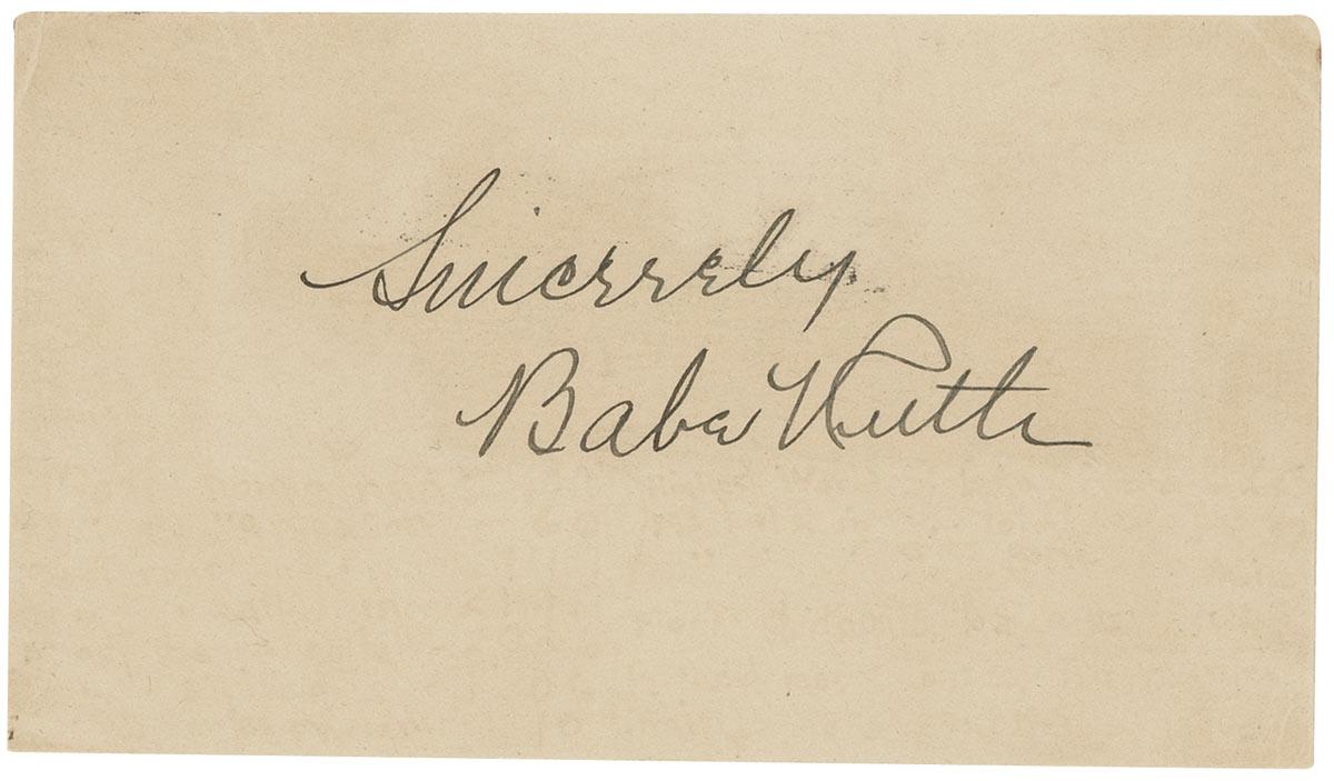 Vintage fountain pen signature, “Sincerely, Babe Ruth,” on a 5.5 x 3.25 government postcard (postmarked 6/2/35). In fine condition, with a mild shade of toning surrounding signature, the result of the signature side of the card having been professionally cleaned, and a few light brushes to sentiment. Accompanied by a full letter of authenticity from PSA/DNA. Ruth played the final game of his career on May 30, 1935. A highly displayable signature dating from Ruth’s transition out of baseball.