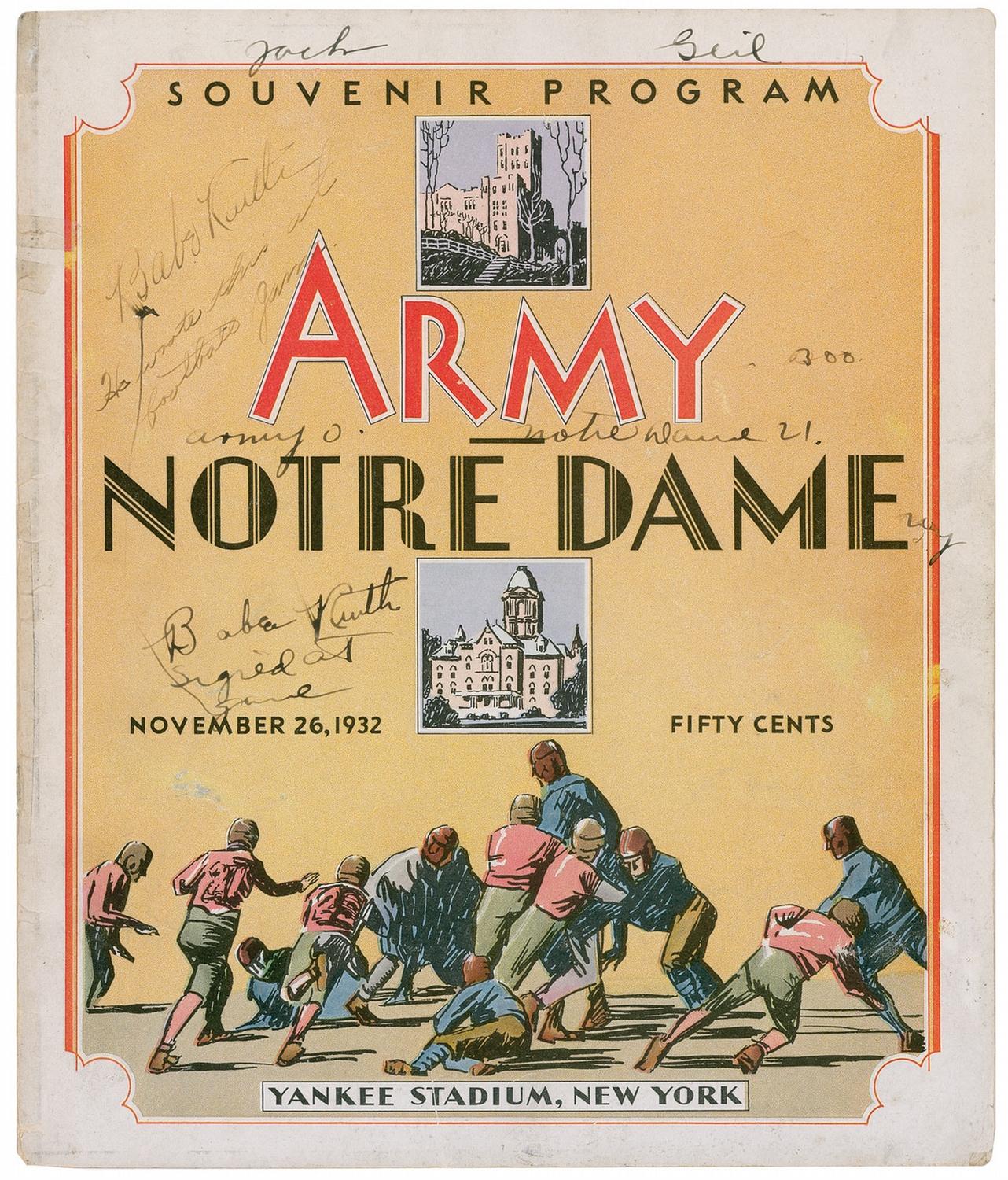 Program cover from the Army/Notre Dame football game held at Yankee Stadium on November 26, 1932, 8.5 x 11, signed on the cover in fountain pen “Babe Ruth.” A collector’s notations to the cover reads, “He wrote this at a football game,” and “Babe Ruth signed at game,” and also writing the score of the game across the front. Notre Dame upset Army that year by a score of 21 to 0. In very good to fine condition, with notations as mentioned (one directly under signature), slight ink brush through first letter of signature, and some light creasing and handling wear. Accompanied by an unsigned original AP photo of Ruth signing autographs for troops ten years later. A visually appealing item featuring the greatest baseball player of all time taking in the game of the year at the historic Yankees Stadium, just one month after his famous ‘called shot.’