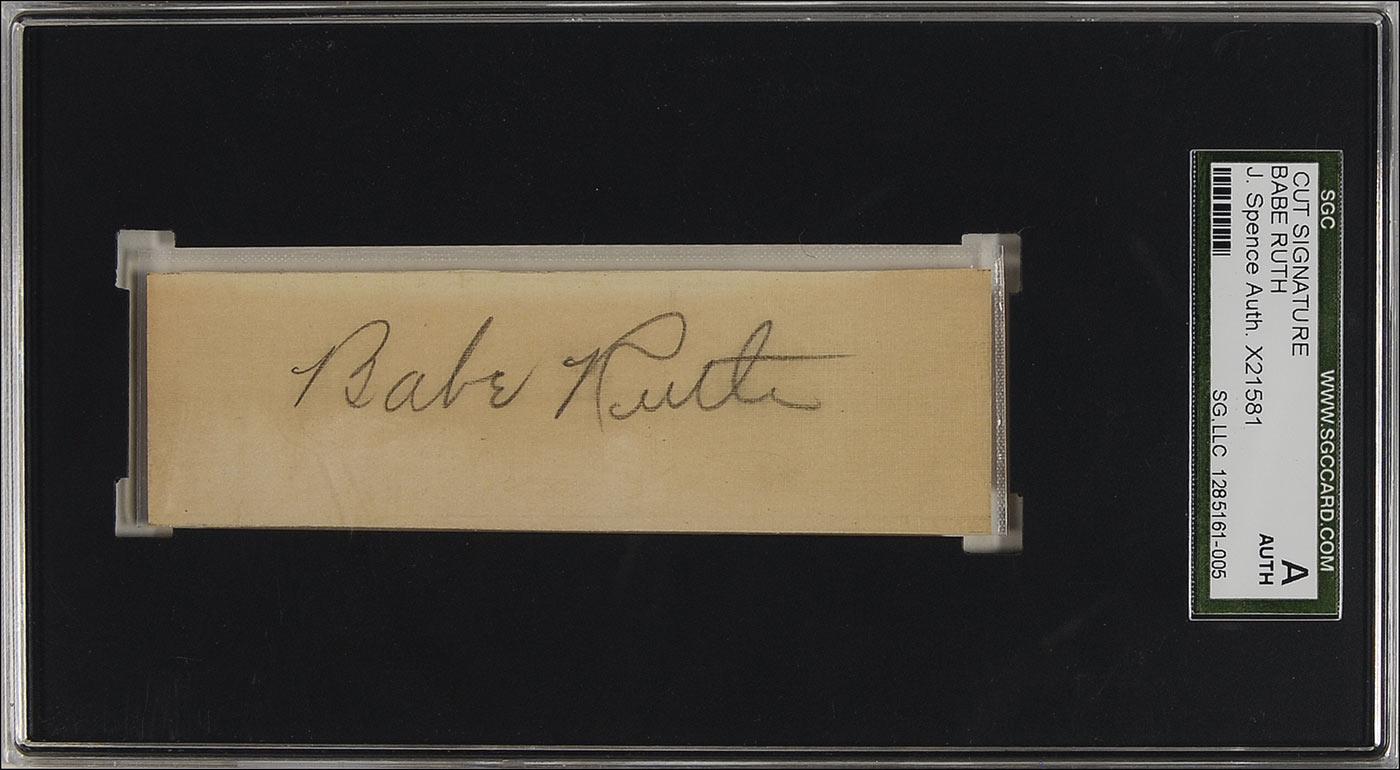 Vintage pencil signature, “Babe Ruth,” on an off-white 4.25 x 1.5 trimmed textured card. Encapsulated in a plastic SGC authentication holder. In fine condition, with some mild toning and a bit of expected light soiling.