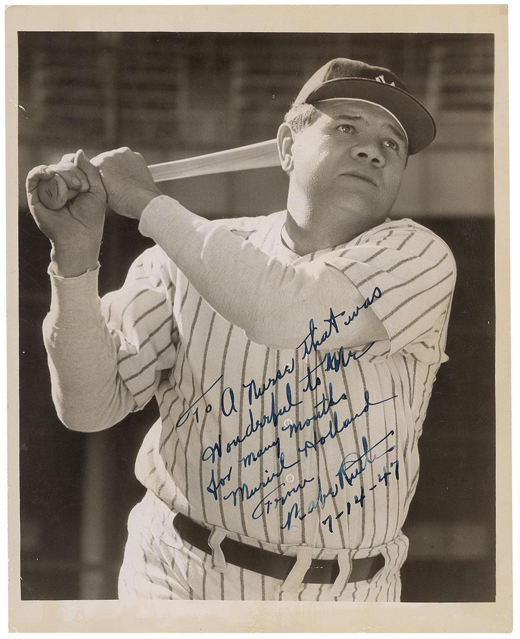Vintage glossy 8 x 10 photo, signed and inscribed in fountain pen, “To a Nurse that was Wonderful to Me for many months Muriel Holland. From Babe Ruth, 7-14-47.” Surface creases, impressions, scattered scratches, a strip of crazing along the right side, faint toning to the extreme edges, and some small areas of staining to the emulsion, otherwise fine condition. Muriel Holland’s role in Ruth’s life was paramount, as it was she who cared for him during a bitter illness from January through July of 1947. Ruth delivered this heart-felt inscription of gratitude to Holland when her time as caretaker had come to an end.