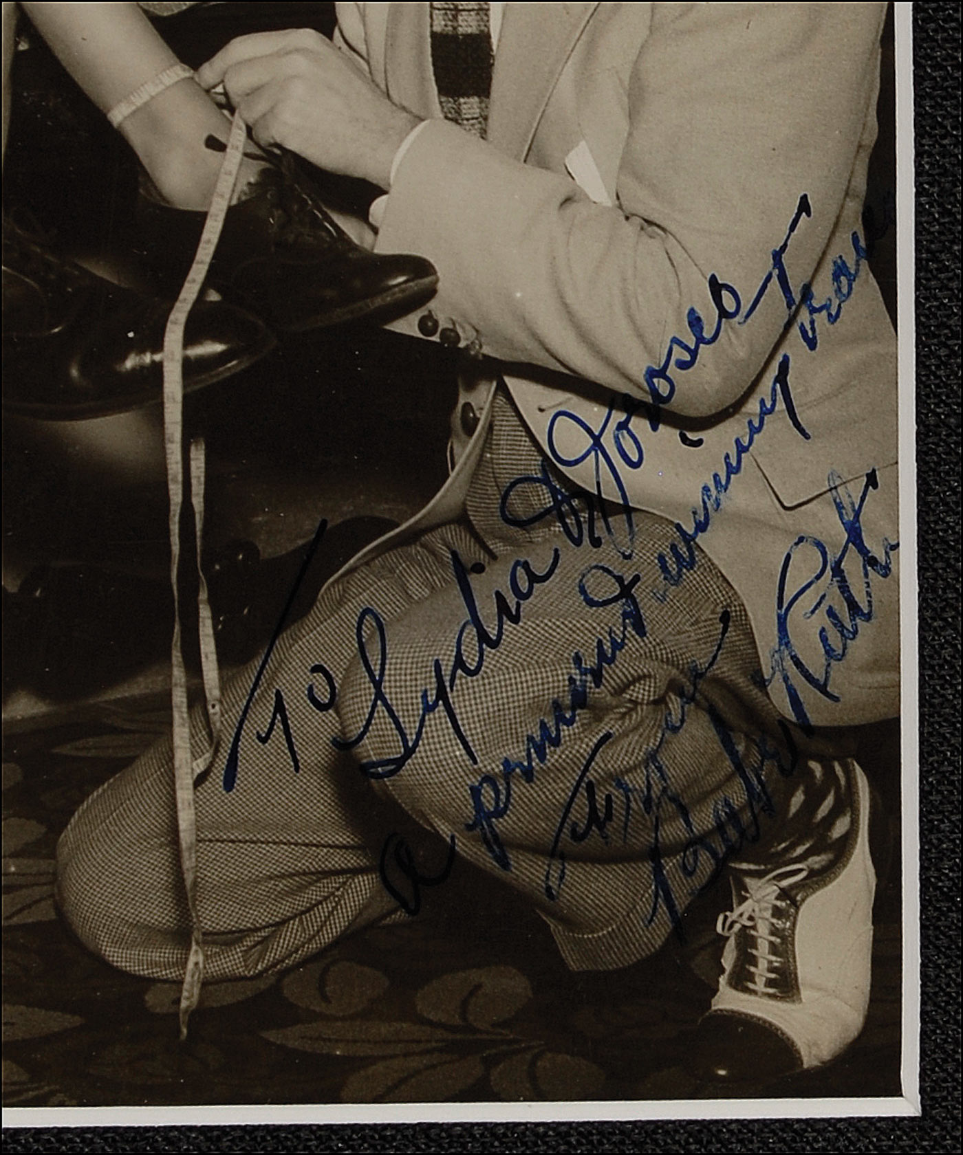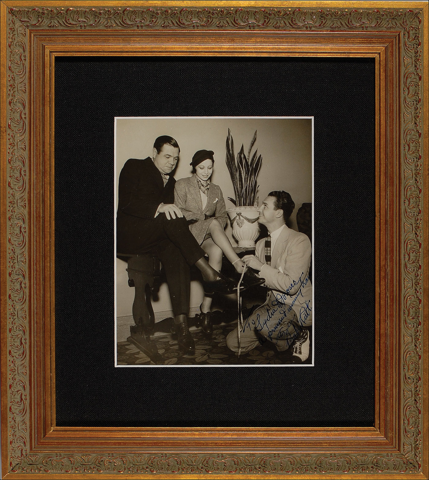 Vintage glossy 7.5 x 9.25 photo of Ruth and his wife as Mrs. Ruth has her ankle measured, signed and inscribed in fountain pen “To Lydia & Joroses, a pennant winning team, From Babe Ruth.” Cloth-matted and framed to an overall size of 16 x 18. Some scattered creases with a few touching Ruth’s body, surface impressions, a few scuff marks, and a bit of silvering to the darker portions, otherwise fine condition. Accompanied by a full letter of authenticity from James Spence Authentication.