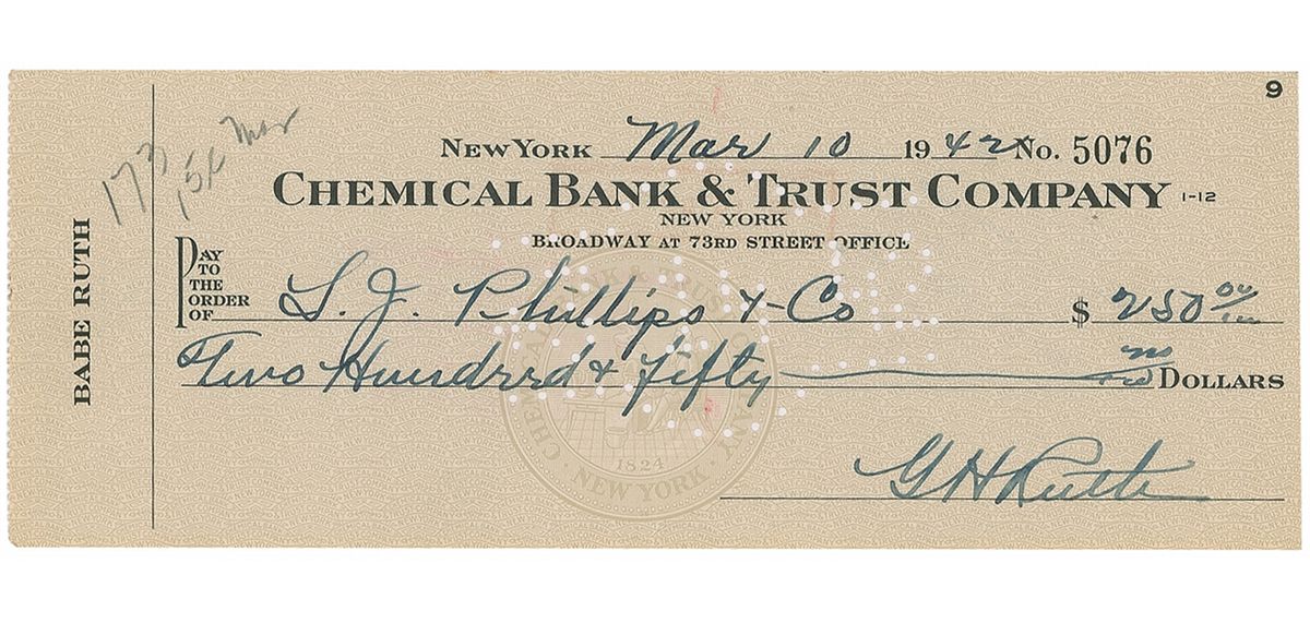 Personal check, 8 x 3, filled out and signed by Ruth, “G. H. Ruth,” payable to L. J. Phillips & Co. for $250.00, March 10, 1942. In fine condition, with an unobtrusive central vertical fold, a couple trivial creases, expected cancellation holes and stamps, and a pencil notation to the upper left. The signature area remains extremely clean.