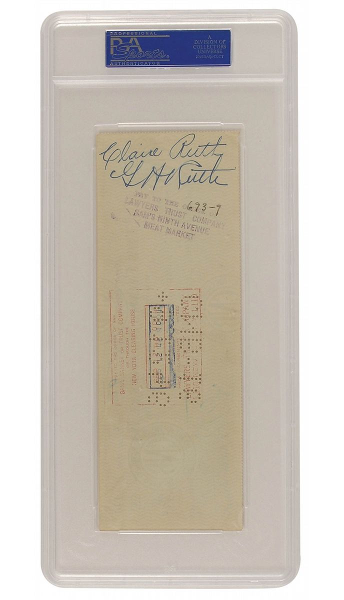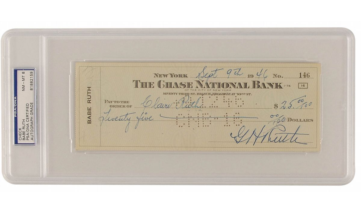 Twice-signed personal check, 8.5 x 3, filled out in another hand and signed by Ruth, “G. H. Ruth,” payable to Claire Ruth for $25.00, September 9, 1946. Also endorsed by Ruth on the reverse, “G. H. Ruth,” as well as by his wife, “Claire Ruth.” Encapsulated in a plastic PSA/DNA authentication holder and given an autograph grade of NM-MT 8. Light scattered creases, and expected bank stamps and notations, one notation trivially affecting the signature on the front, otherwise fine condition.