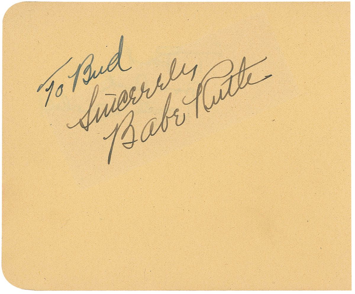 Vintage fountain pen signature and inscription, “To Bud, Sincerely, Babe Ruth,” on an off-white 5.25 x 4.5 album page. In fine condition, with a light block of toning over the signature and sentiment from previous display.