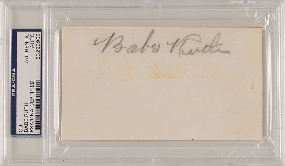 Desirable vintage pencil signature, “Babe Ruth,” on an off-white 5 x 2.75 card. Encapsulated in a plastic PSA/DNA authentication holder. A couple light creases, toned tape remnants below the signature, and some slight brushing to the signature, otherwise fine condition.