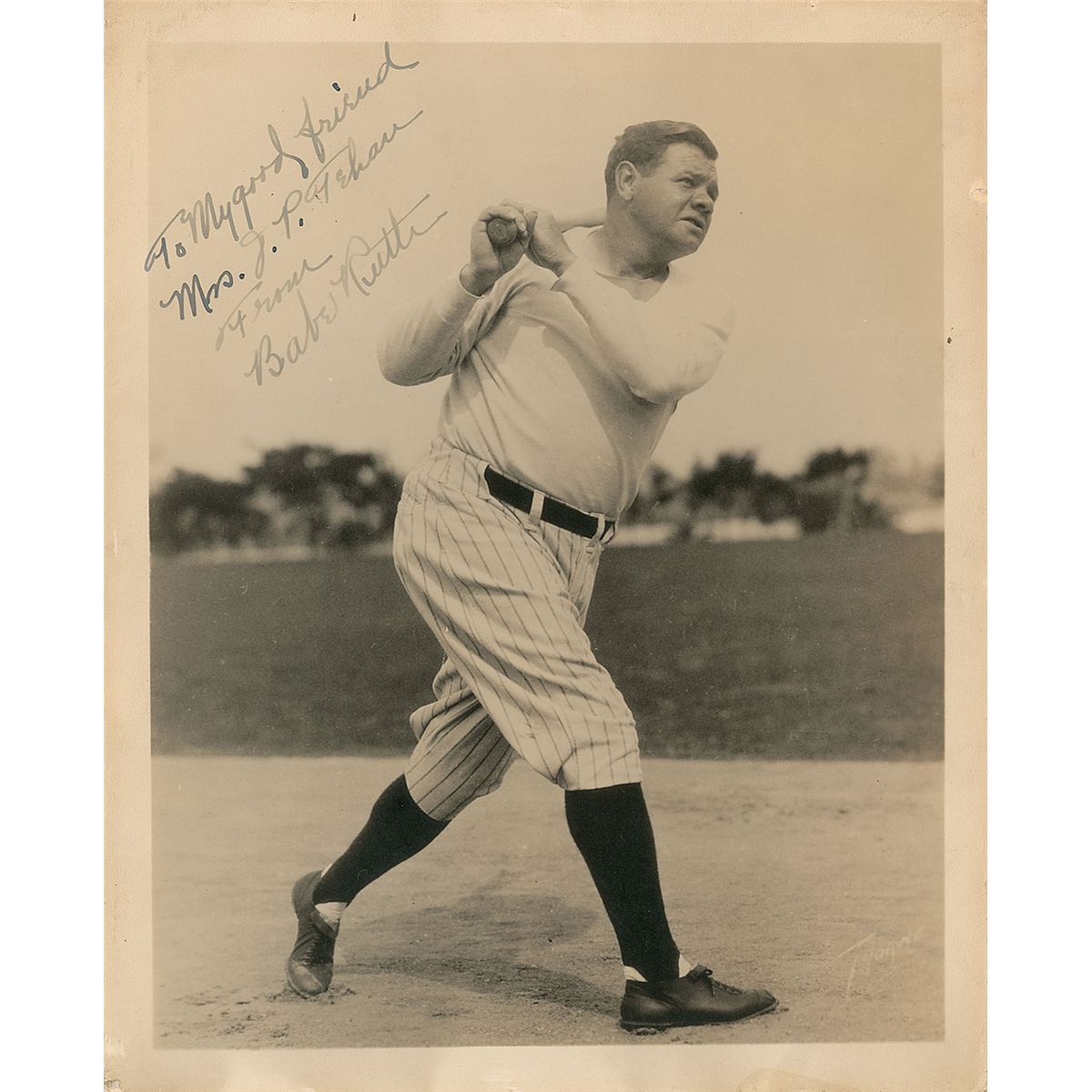 Highly desirable vintage matte-finish 8 x 10 full-length photo of Ruth posing at the end of one of his mighty swings, signed and inscribed in fountain pen, “To my good friend, Mrs. J. P. Tehan, From, Babe Ruth.” Mild scattered soiling, a tack hole to the right edge, and slight rippling to top edge, otherwise fine condition. Accompanied by a full letter of authenticity from JSA. A fantastic pose of the ‘Sultan of Swat.’