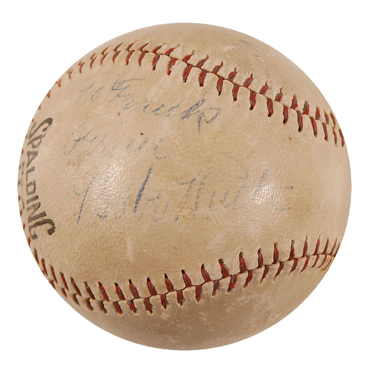 Official Spalding No. 4 ‘Match Ball’ baseball signed and inscribed in blue ink on a side panel, “To Frank, From, Babe Ruth.” Signature and inscription fairly light due to irregular ink adhesion and fading, but mostly legible, and scattered dings and scuffs to leather, otherwise very good condition. A collectible example of the always highly desirable single-signed vintage Ruth baseball.