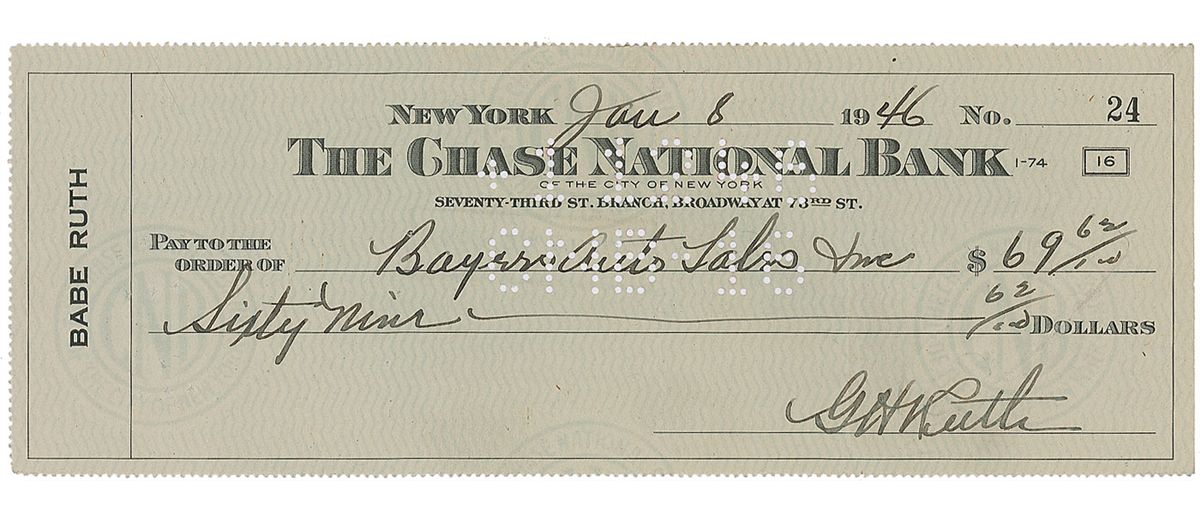 Personal check, 8.5 x 3, filled out and signed by Ruth, “G. H. Ruth,” payable to Bayers Auto Sales Inc. for $69.62, January 8, 1946. In fine condition, with two vertical folds, one through a single letter of signature, staple holes to left edge, and cancellation holes to body.