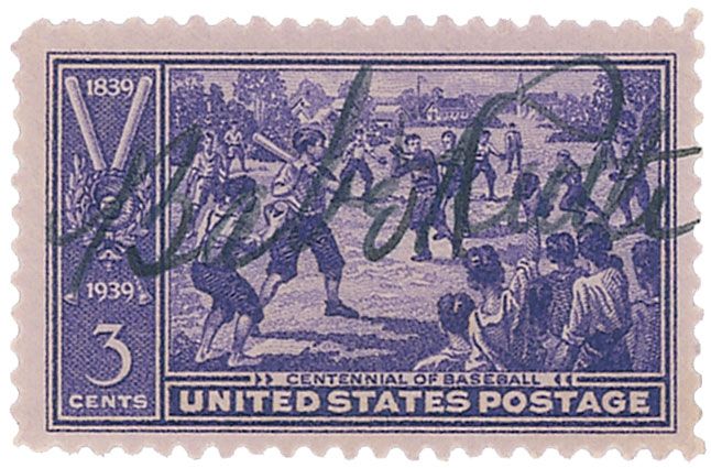 United States 3-cent postage stamp, 1.5 x 1, 1939, commemorating the centennial of baseball, signed in black ink by Ruth. In fine condition, with moderate contrast to the signature. A rare and desirable format.