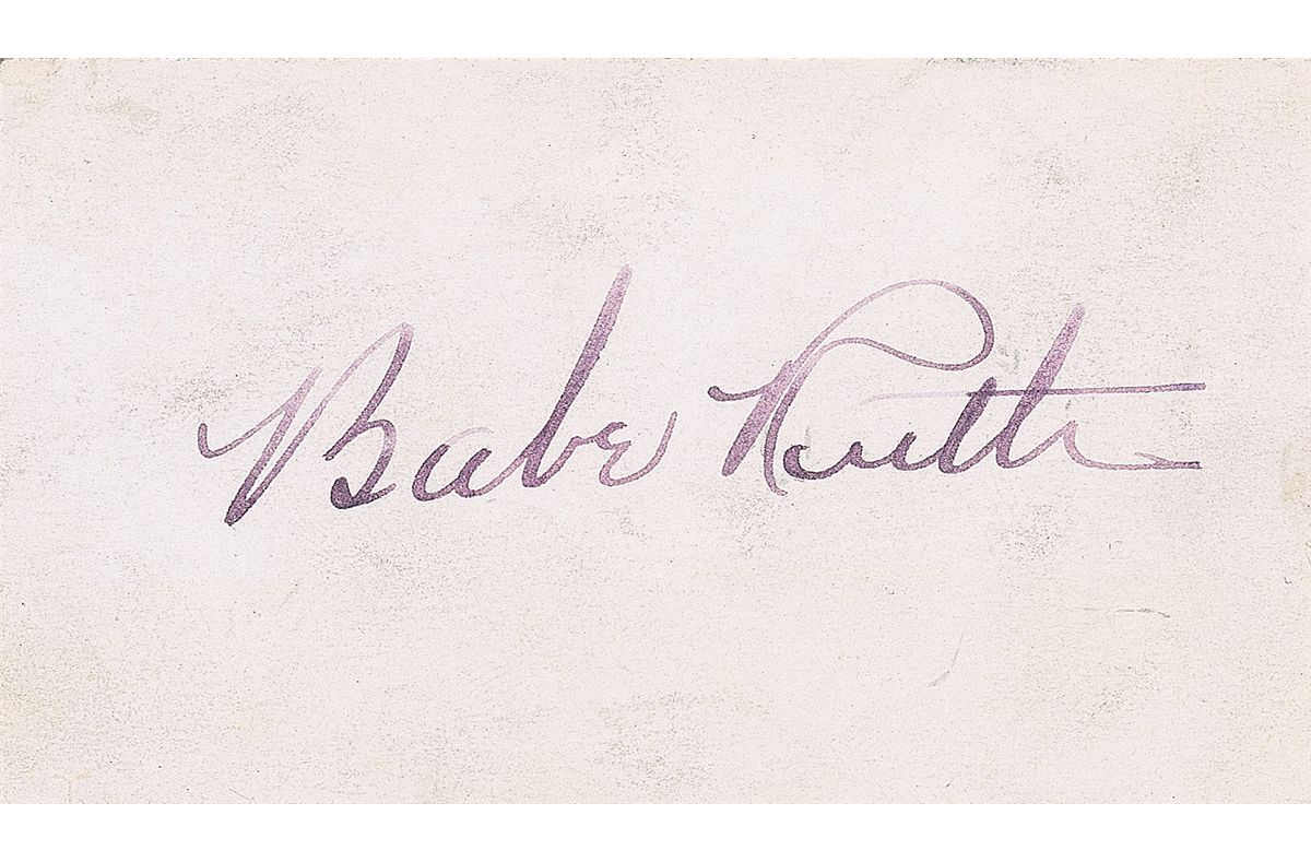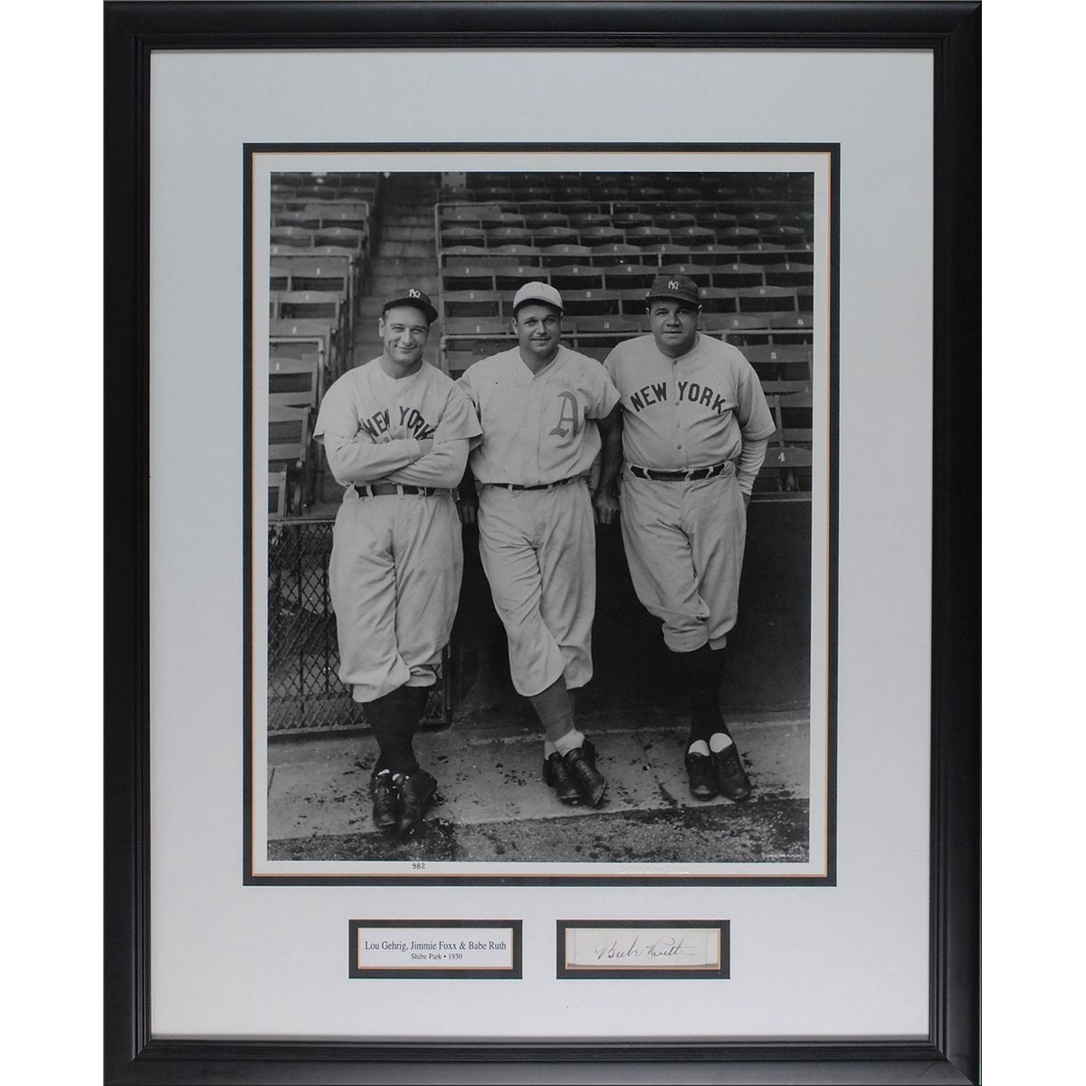 Choice vintage fountain pen signature, “Babe Ruth,” on an off-white 3.5 x 1 slip. Beautifully double-matted and framed with an enormous Bruce Murray Collection photo of Ruth, Lou Gehrig, and Jimmie Foxx to an overall size of 23.25 x 29.25. In fine condition. Oversized.
