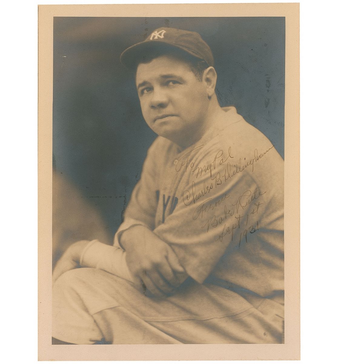 Vintage matte-finish 8 x 11 photo of Ruth posing in his Yankees road uniform, believed to be the work of noted Chicago photographer George Burke, signed and inscribed in fountain pen, “To my pal Charles B. Dillingham from Babe Ruth, Sept. 1, 1931.” Photo is mounted to an identical size cardboard backing. In very good condition, with a few scattered light surface marks and creases, a few thin mild stains, light contrast to signature, and moderate silvering to darker areas of image and background. Accompanied by a full letter of authenticity from PSA/DNA, as well as a letter of authenticity from James Spence. Ruth’s Yankees dropped a double header to the Red Sox on the date he signed this photo. A fine image of baseball’s most iconic figure.