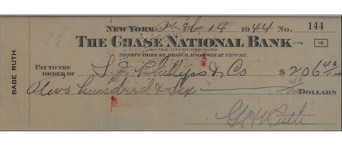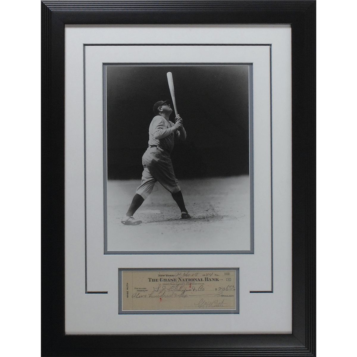 Personal check, 8.25 x 2.75, filled out and signed by Ruth, “G. H. Ruth,” payable to S. J. Phillips & Co. for $206.40, February 14, 1944. Double-matted and framed with an exceptional oversized full-length portrait of Ruth taking a cut to an overall size of 20.5 x 26.5. Expected cancellation holes, light show-through from stamps on reverse, and Ruth’s signature a shade or two light but completely legible, otherwise fine condition.