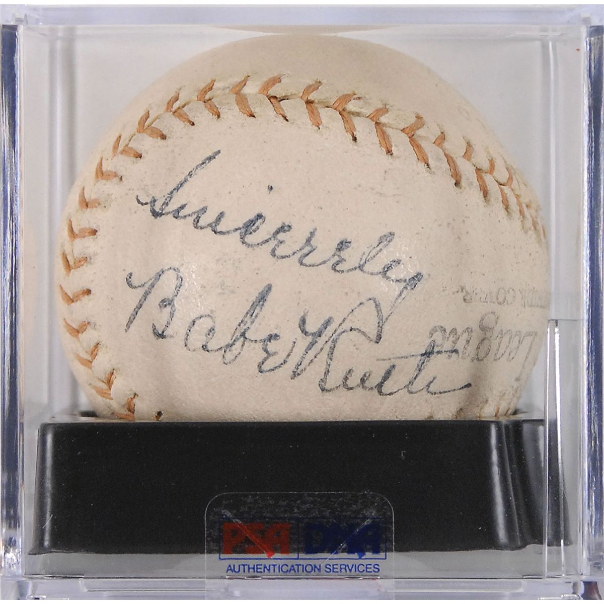 Official MacGregor–Goldsmith Pioneer League baseball signed in black fountain pen on a side panel, “Sincerely, Babe Ruth.” Signature dates from between 1946-1948. In fine condition, apparently cleaned or sanded, with a few light ink remnants of possibly removed signatures. Accompanied by a full letter of grading and authenticity from PSA/DNA, grading the autograph a “7,” the ball a “2,” and the overall grade a “4.5.” A particularly bold signature, with Ruth adding a seldom-seen sentiment, which he rarely did on baseballs.