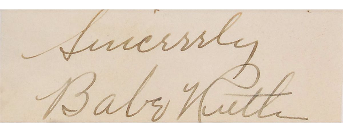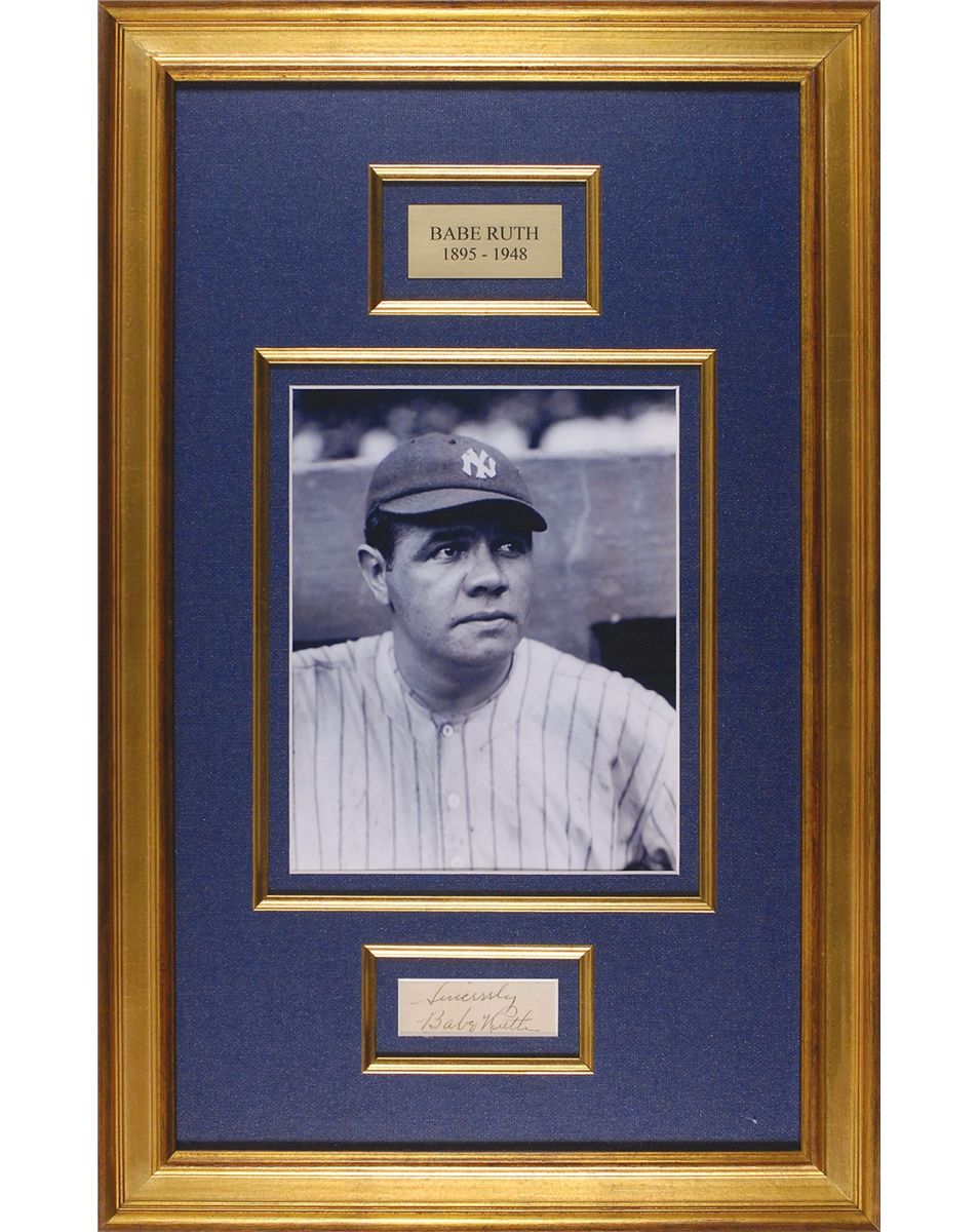 Very nice vintage fountain pen signature, “Sincerely, Babe Ruth,” on an off-white slip. Double-cloth-matted and framed with a great photo of Ruth and a small name plaque to an overall size of 15.75 x 25. In fine condition. Oversized.