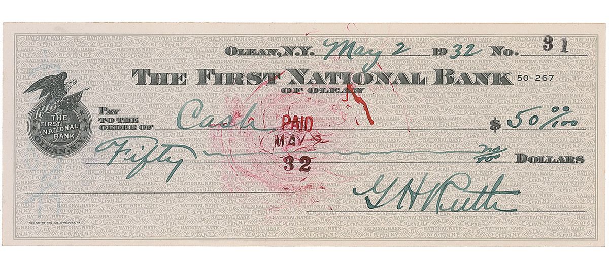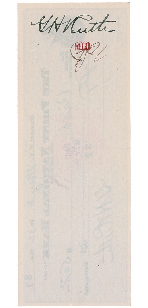 First National Bank check, 8 x 3, filled out and signed by Ruth, “G. H. Ruth,” payable to cash for $50, May 2, 1932. Check is also endorsed on the reverse, “G. H. Ruth.” In fine condition, with central vertical fold and bank stamp (not affecting signature or legibility of writing). This is the first twice-signed check we have offered from Ruth’s playing days with the Yankees.