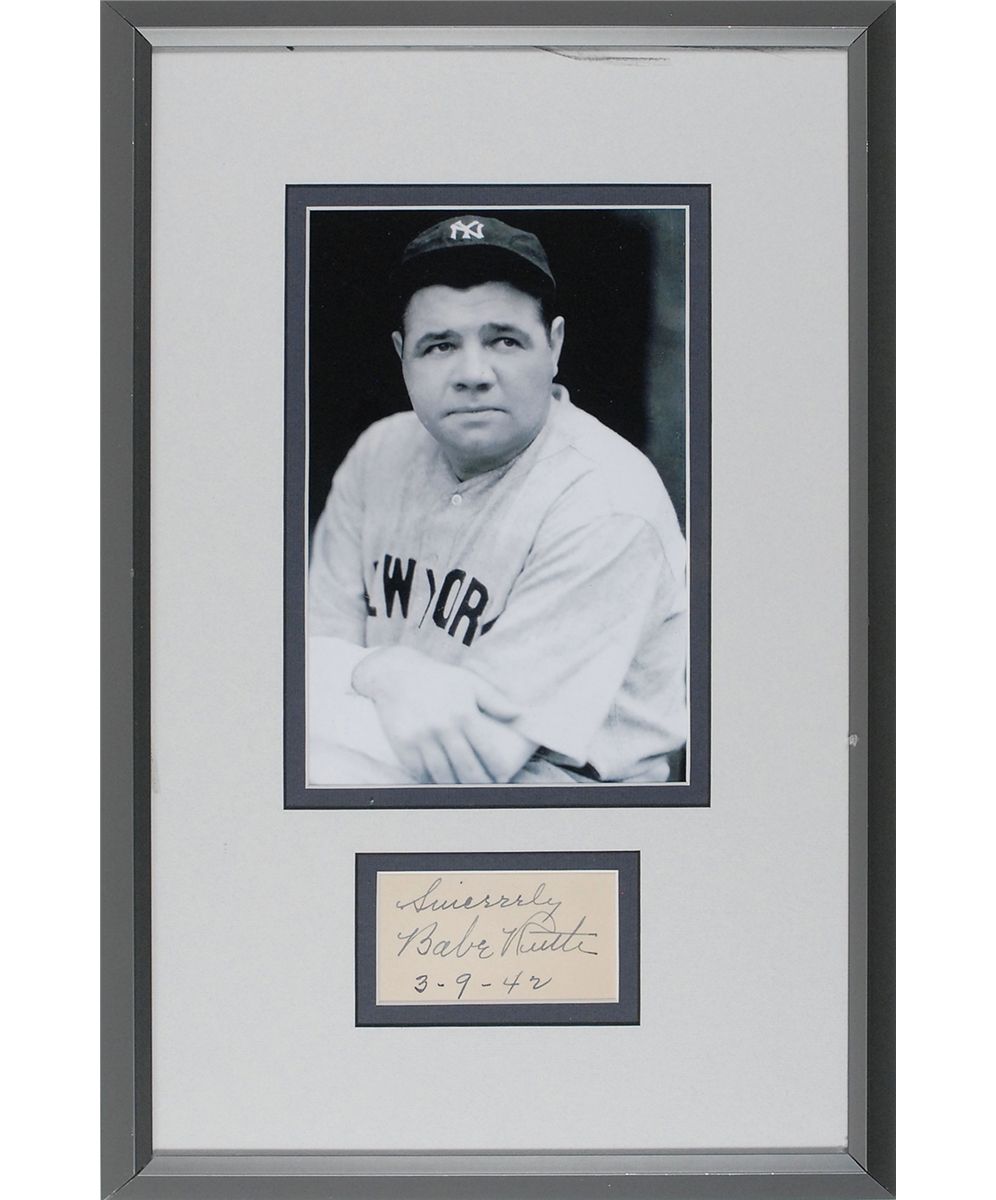 Excellent fountain pen signature, “Sincerely, Babe Ruth, 3-9-42,” on an off-white book page. Double-matted and framed with a portrait of Ruth in his Yankees road uniform to an overall size of 12.25 x 19. In very fine condition. Accompanied by a full letter of authenticity from PSA/DNA, which notes an inscription to the page as well, which has been tastefully matted out in the presentation. A fantastic signature acquired by a lucky fan, most likely during one of Ruth’s many personal appearances on behalf of the war effort.