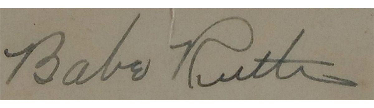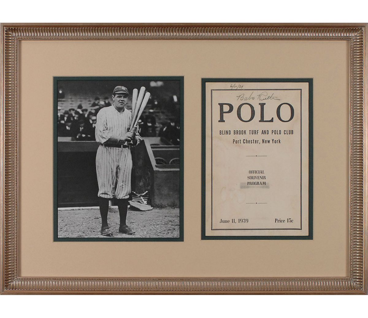 Program from the Blind Brook Turf and Polo Club of Port Chester, New York, dated June 11, 1939, 6 x 9, signed at the top in fountain pen and dated in another hand. Attractively double-matted and framed with an unsigned photo of Ruth with the Yankees to an overall size of 21.25 x 15.75. In very good condition, with light scattered dampstaining and an unobtrusive tear extending from the top edge to the top of the ‘R.’ Less than a month later, Ruth would speak at ‘Lou Gehrig Day,’ during which Gehrig announced his early retirement.