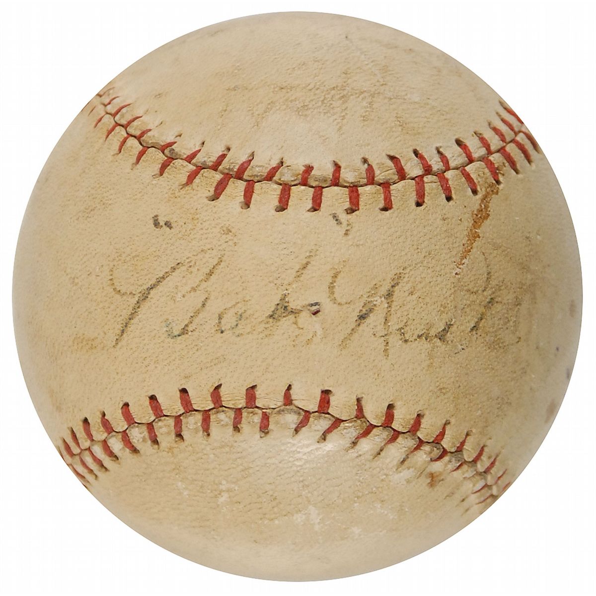 Official Spalding King of the Diamond League baseball signed in fountain pen on the sweet spot, “‘Babe’ Ruth.” In very good condition, with scattered scuffs, dings, and soiling (affecting a few areas of the signature), and portions of the signature a few shades light (particularly the end of his last name). A sought-after baseball with the preferable early version of his signature—Ruth stopped putting quotation marks around his first name some time in 1928.