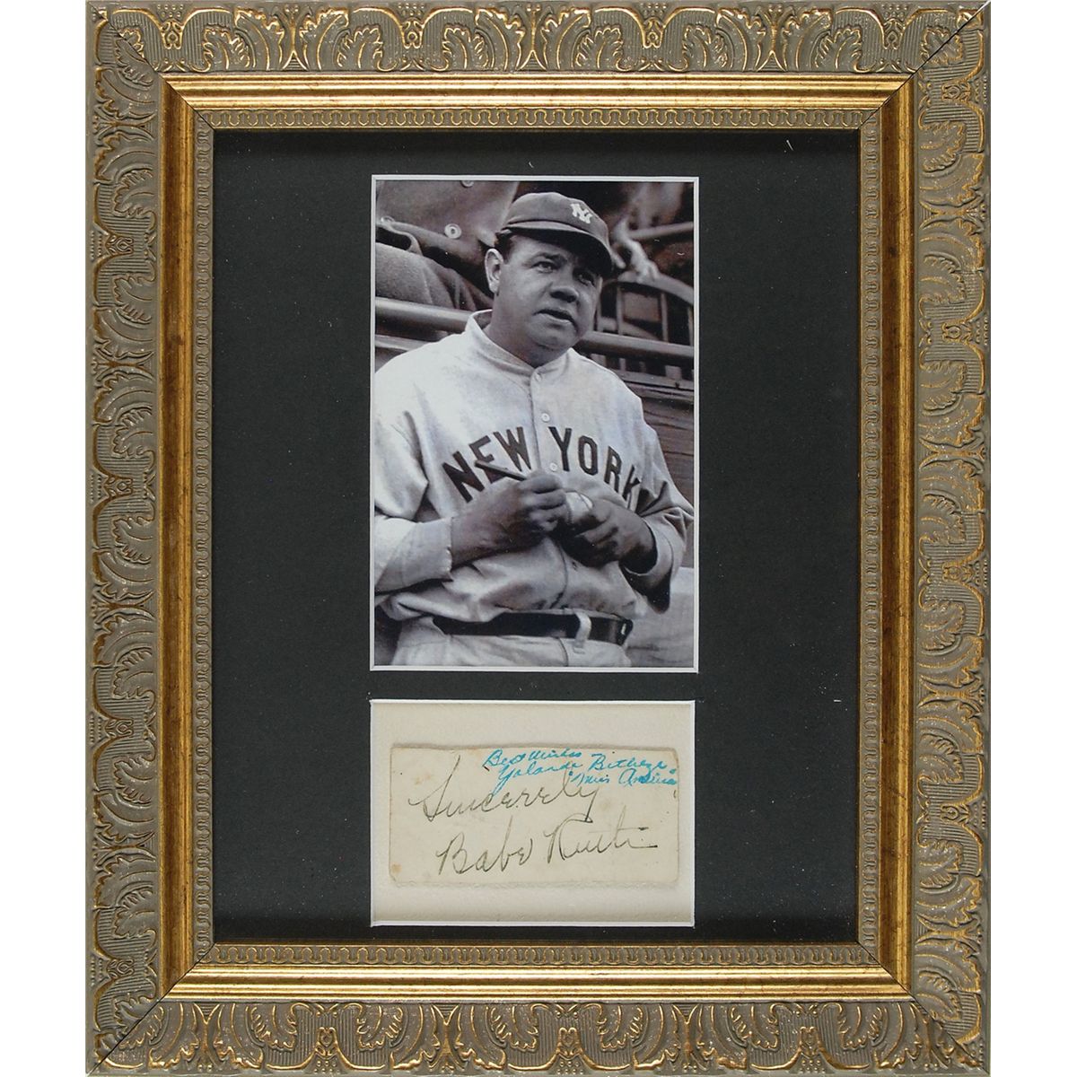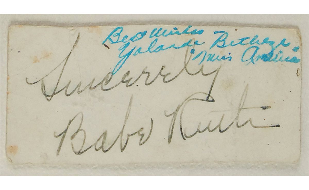 Fountain pen signature, “Sincerely, Babe Ruth,” on an off-white 3.5 x 1.5 card. Also signed later by the young lady crowned Miss America in 1951, “Best wishes, Yolande Betbeze, ‘Miss America.’” Attractively matted and framed with an image of Ruth to an overall size of 10.5 x 12.5. In very good condition, with moderate overall creases and light soiling. Betbeze was rumored to have dated Joe DiMaggio, though it is also claimed that they were just friends—in later interviews, Betbeze revealed rather intimate details regarding Joltin’ Joe’s anatomy, offering further evidence of the former. The original collector was almost certainly well-connected to the New York Yankees organization or the city’s elite social scene, given that Ruth passed away at least three years prior to Betbeze’s signing the same card.