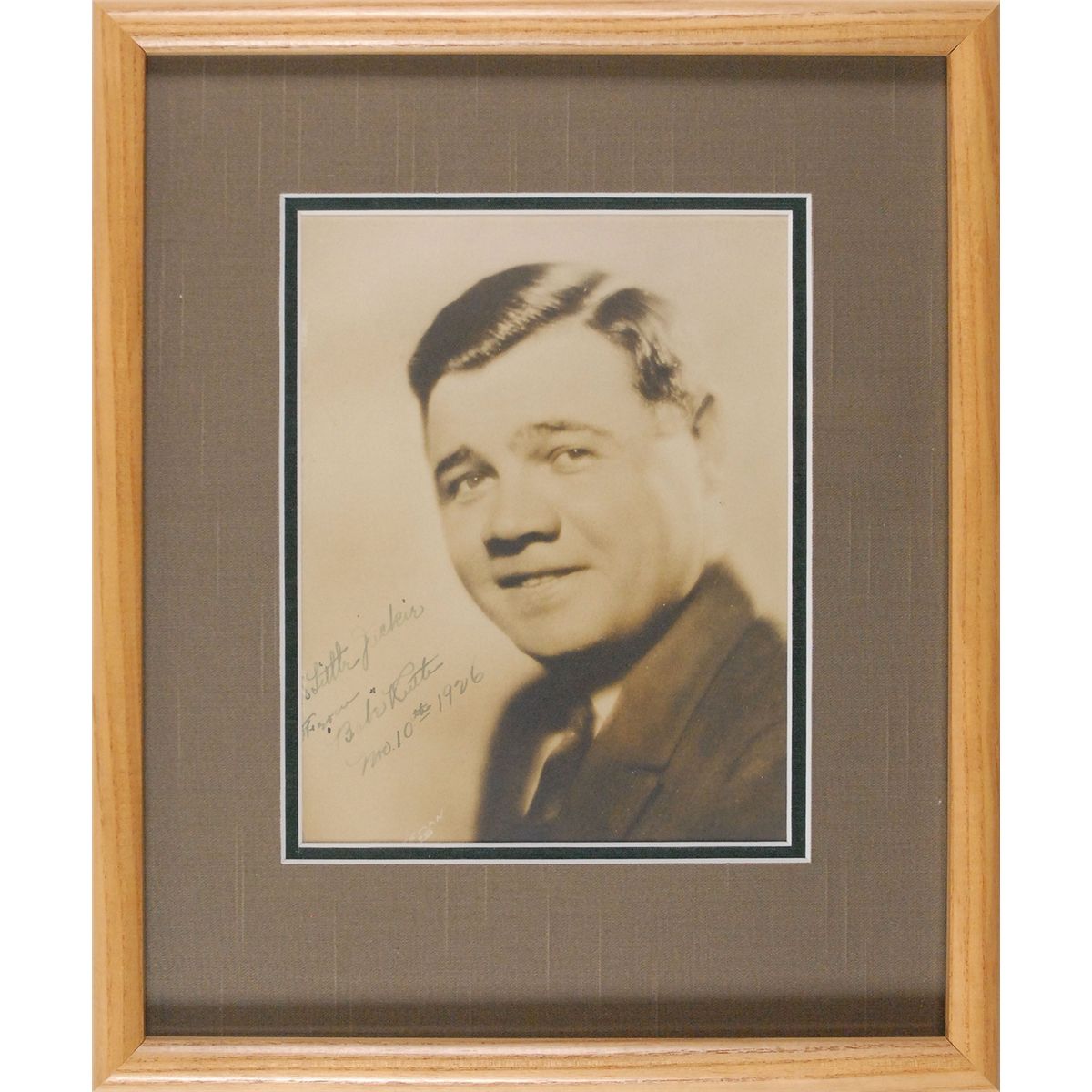 Uncommon and rather early matte-finish 6 x 8 formal studio portrait of Ruth in a suit and jacket, signed and inscribed in fountain pen, “[To] Little Jackie, From ‘Babe’ Ruth, Nov. 10th 1926.” Double-cloth-matted and framed to an overall size of 10.75 x 13. In very good condition, with irregularly trimmed edges and some mounting remnants to edges (affecting the very beginning of the inscription). At the time Ruth signed this photo, he was cultivating his ‘larger-than-life’ persona by way of a 12-week vaudeville tour through the midwest and west. He had arrived in Fargo, North Dakota, on November 8, where he performed ten shows. Part of his act was inviting children from the audience up on stage, where he playfully asked them questions, joked around, and gave them baseballs as gifts—“Little Jackie” was probably one of the children he met at a performance. An intriguing piece from a little known offshoot of Ruth’s ballplaying career.