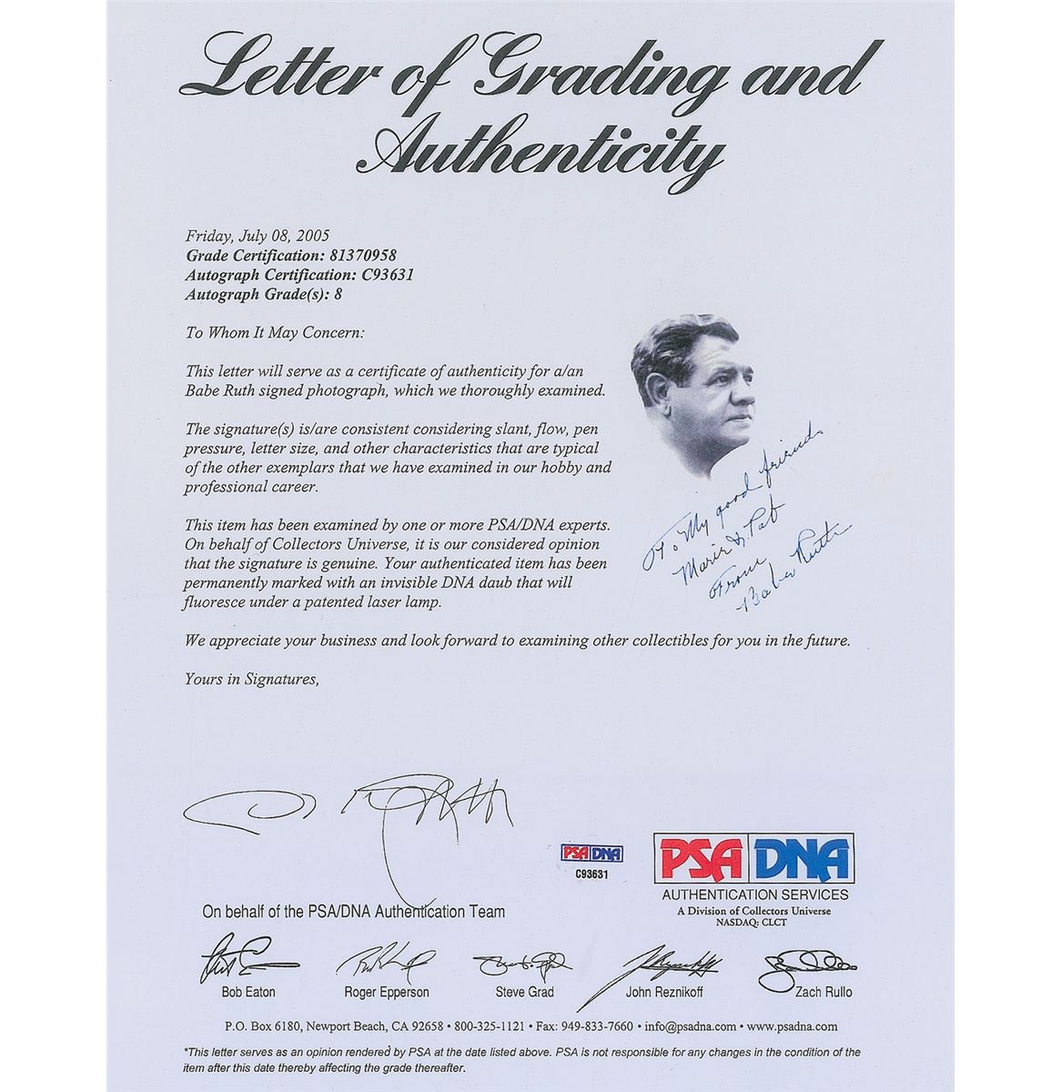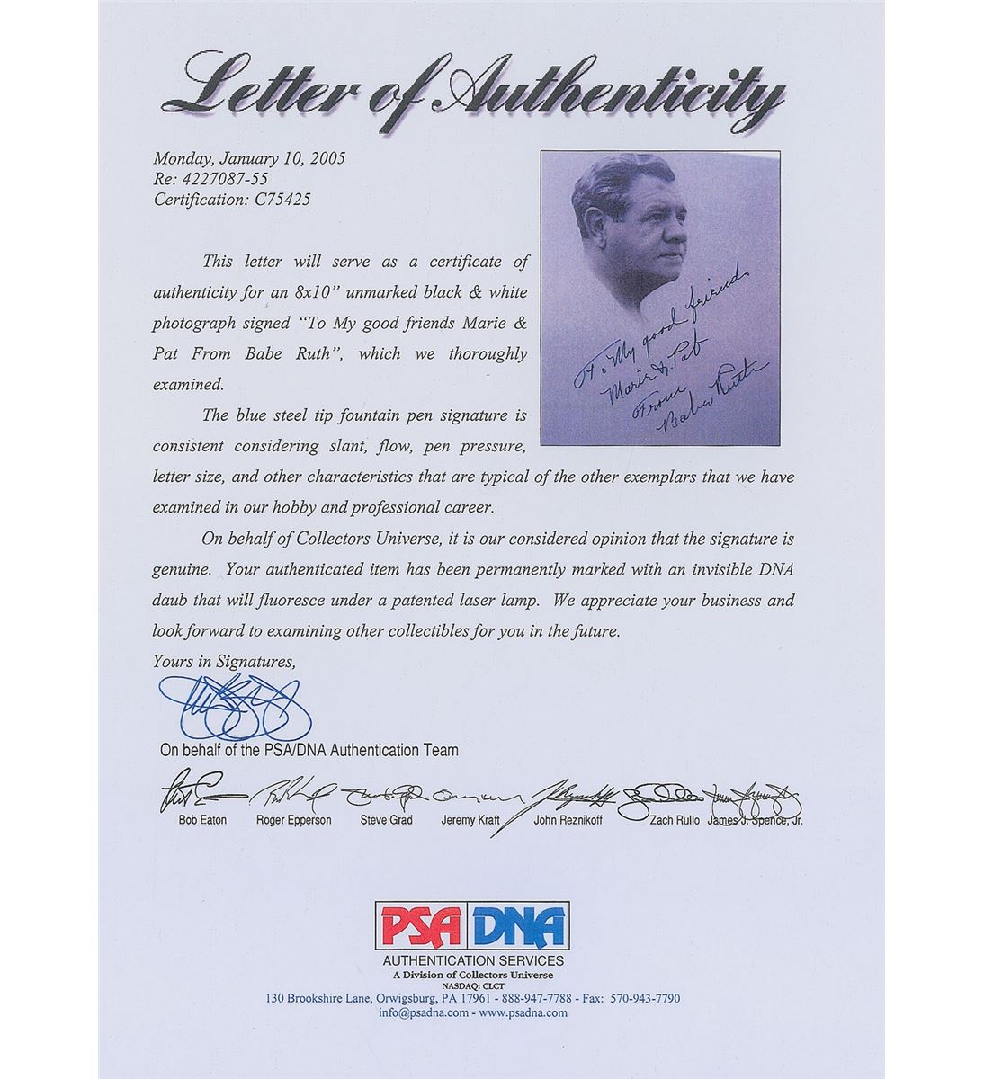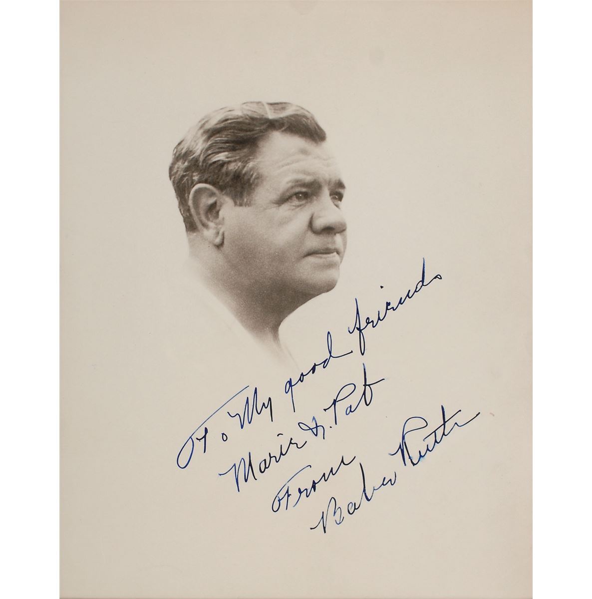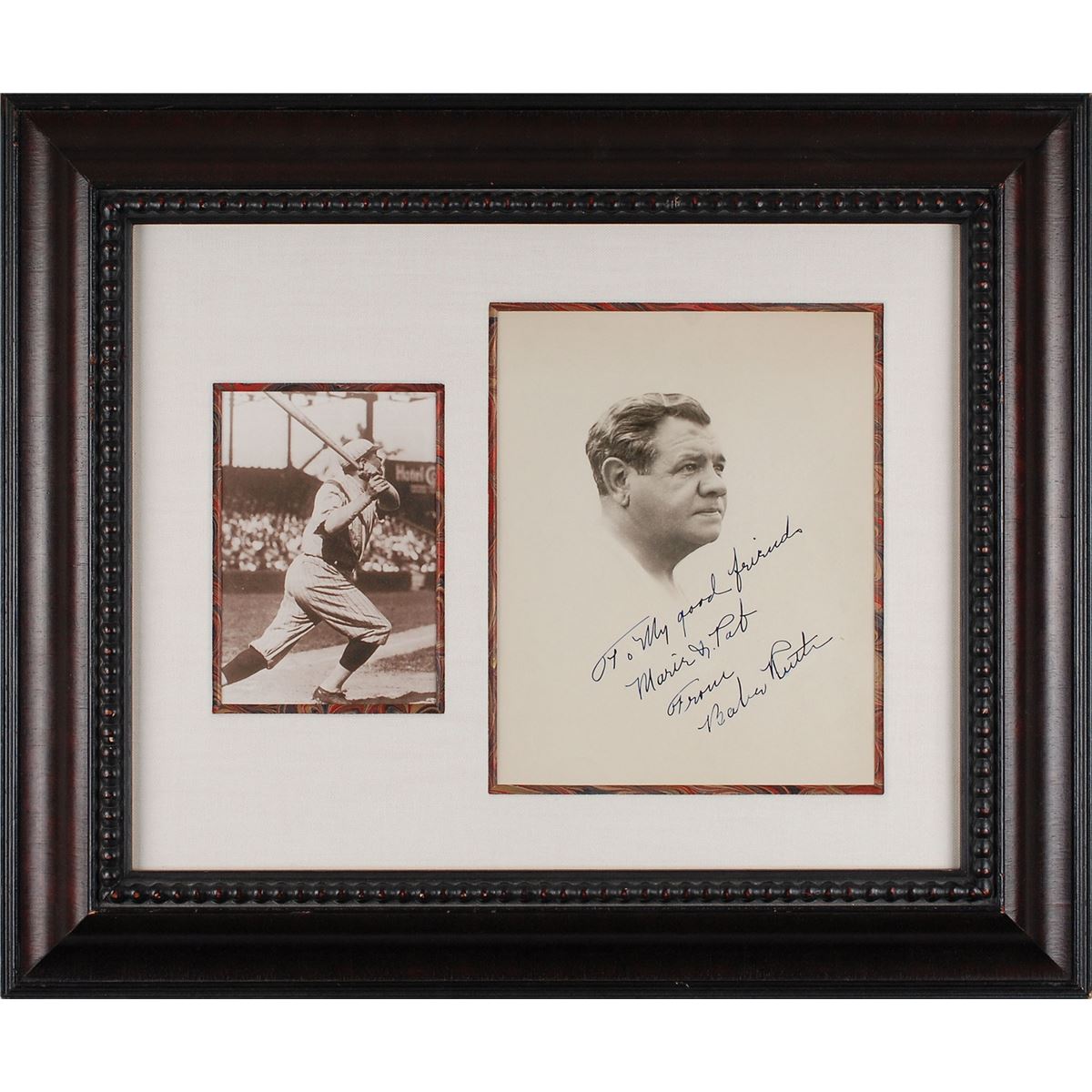 Outstanding matte-finish 7.5 x 9.5 headshot of Ruth gazing into the distance, signed and inscribed against the stark white background in bold fountain pen, “To my good friends Marie & Pat, From Babe Ruth.” Double-cloth-matted and framed with a photo of Ruth finishing a swing to an overall size of 22 x 18.5. A few surface creases and slight brushing to signature, otherwise fine condition. Accompanied by a full letter of authenticity from PSA/DNA.