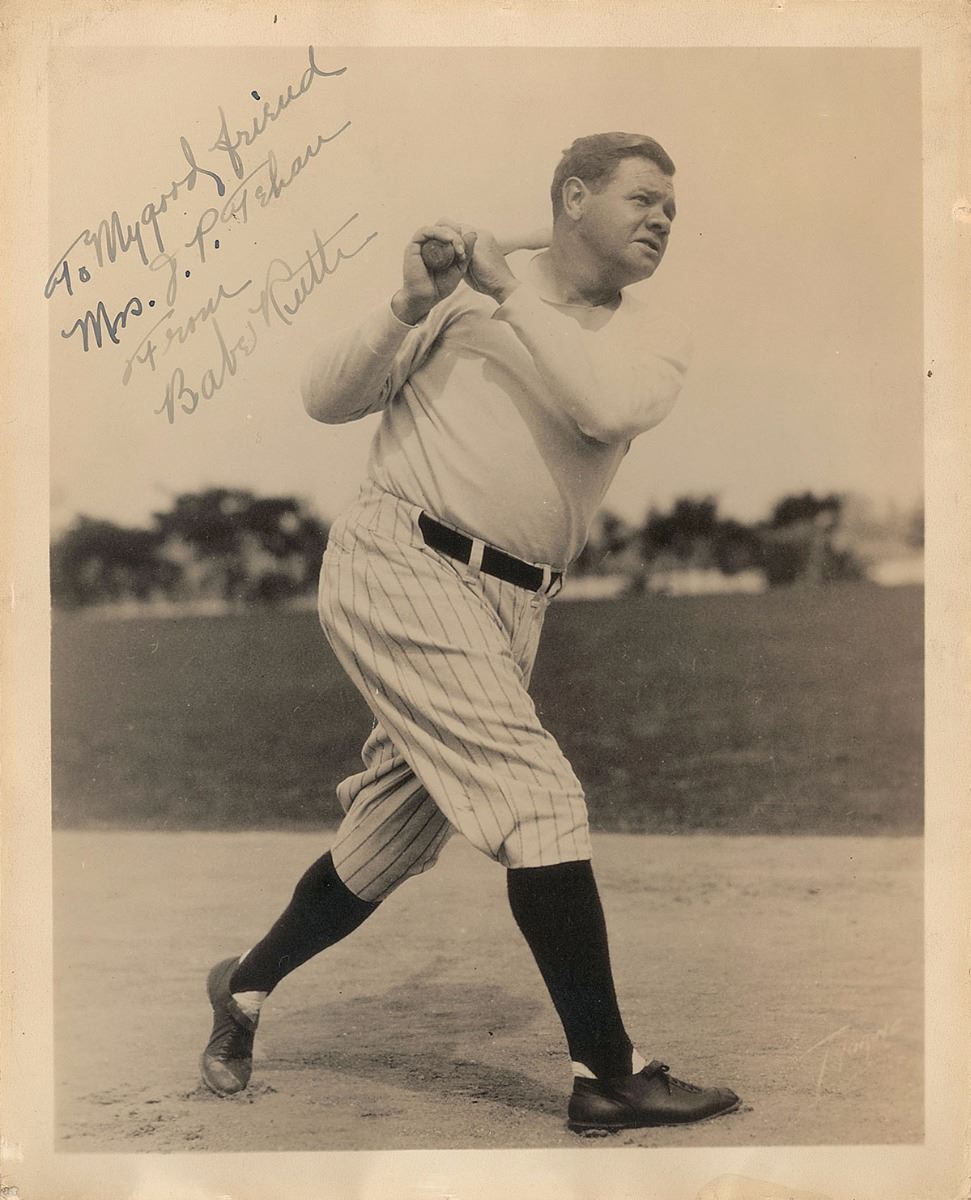 Highly desirable vintage matte-finish 8 x 10 full-length photo of Ruth posing at the end of one of his mighty swings, signed and inscribed in fountain pen, “To my good friend, Mrs. J. P. Tehan, From, Babe Ruth.” Mild scattered soiling, a tack hole to the right edge, and slight rippling to top edge, otherwise fine condition. Accompanied by full letters of authenticity from PSA/DNA and JSA. A fantastic pose of the ‘Sultan of Swat.’