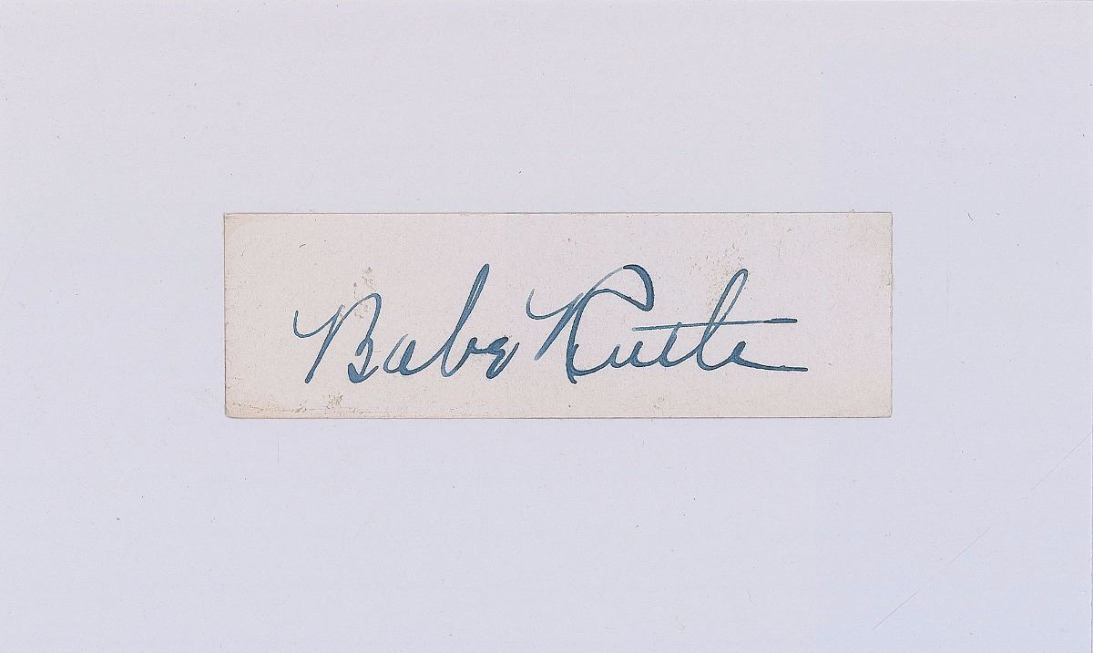 Crisp fountain pen signature, “Babe Ruth,” on an off-white 3 x 1 slip affixed to a white 5 x 3 card. In fine condition, with trivial soiling.