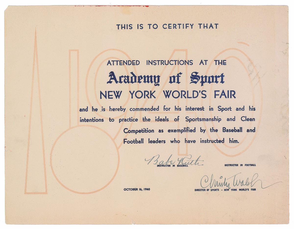 DS, one page, 8.5 x 11, October 16, 1940. Unissued 1940 World’s Fair Academy of Sport attendance certificate, which reads, in part: “This is to Certify that…attended instructions at the Academy of Sport New York World’s Fair and he is hereby commended for his interest in Sport and his intentions to practice the ideals of Sportsmanship and Clean Competition as exemplified by the Baseball and Football leaders who have instructed him.” Signed at the conclusion by Ruth, and also signed by Ruth’s agent Christy Walsh. Scattered soiling and creasing, a few edge dings and small tears, and a missing upper left corner tip, otherwise fine condition. A seldom-seen memento of the home-run champion’s ever-enduring love of the game, and the young fans who would carry it into the future. Accompanied by a full letter of authenticity from PSA/DNA.