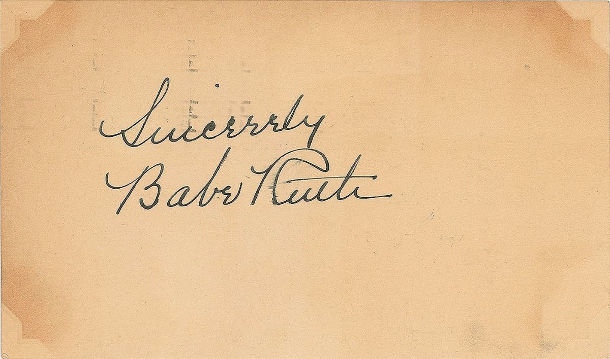 Bold ink signature, “Sincerely, Babe Ruth,” on the reverse of an off-white 5.5 x 3.25 postcard, postmarked January 17, 1942. In very good to fine condition, with some edge imperfections that could be easily matted out.