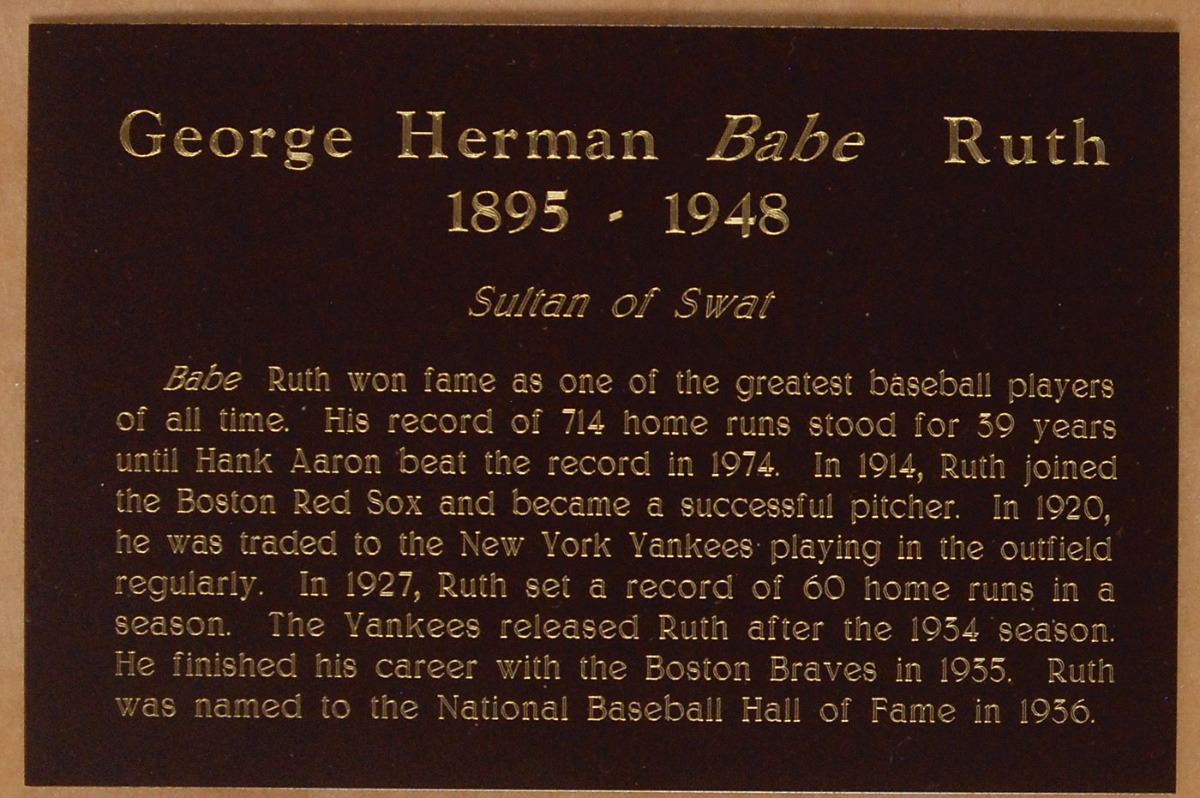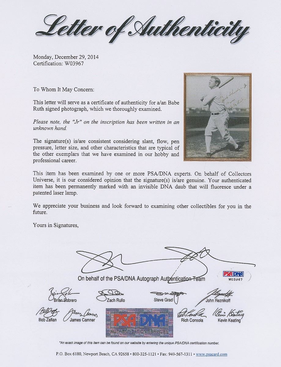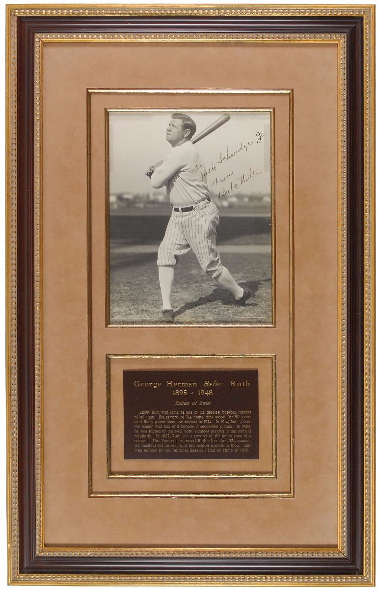 Classic glossy 7 x 9 photo of the ‘Sultan of Swat’ taking a practice swing in a white shirt and his Yankee pinstripe pants, signed and inscribed in fountain pen, “To Jack Schweitzer, From Babe Ruth,” (apparently intended for the recipient’s son, “Jr.” has been added after Schweitzer’s last name in another hand). Archivally double-suede-matted and framed with a biographical plaque to an overall size of 16 x 25. A notation to the lower left dates the photo to July 1928. In very good condition, with scattered creases, some slight tears and small areas of paper loss to edges, and a bit of flaking to ink in inscription and signature. Accompanied by a full letter of authenticity from PSA/DNA. A classic pose of the Babe in his iconic pinstripes. Oversized.