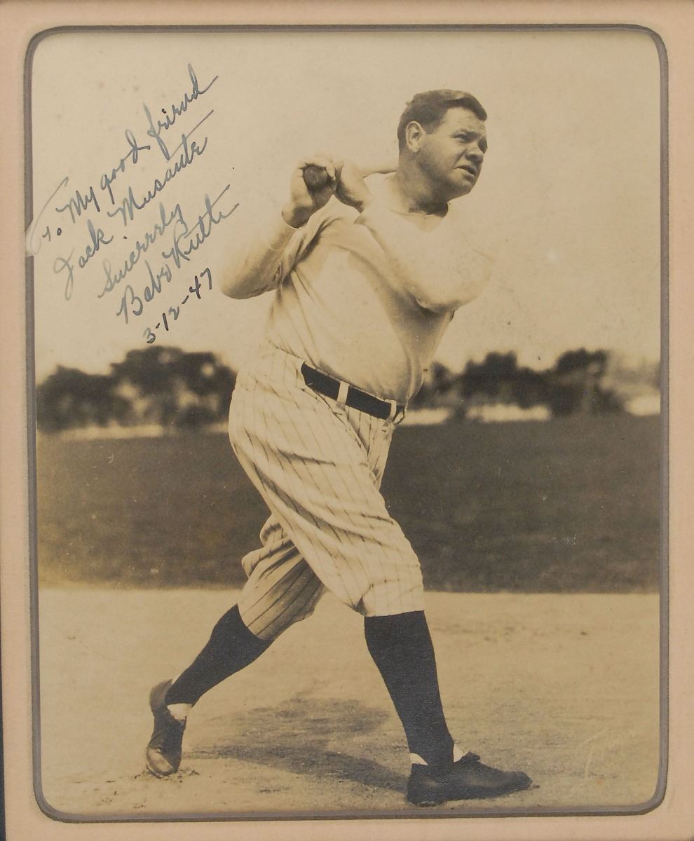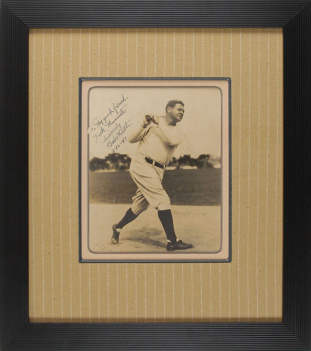 Classic matte-finish 7 x 9 photo of Ruth in his Yankees pinstripe pants, showing off his mighty swing, boldly signed and inscribed in fountain pen, “To my good friend Jack Musante, Sincerely, Babe Ruth 3-12-47.” Archivally triple-cloth-matted in a pinstripe theme and framed to an overall size of 17 x 19; the mat is cut slightly irregularly on the left side to fit the full inscription. In very good to fine condition, with some scattered light foxing and spotting and a crease or small tear to the lower left edge; the signature and inscription are bold and attractive, ideally signed against the light background. Accompanied by a full letter of authenticity from PSA/DNA. The month after signing this photo, on April 27, 1947, the Yankees celebrated ‘Babe Ruth Day’ at Yankee stadium, honoring the slugger and his legendary career.