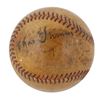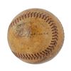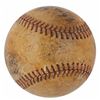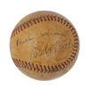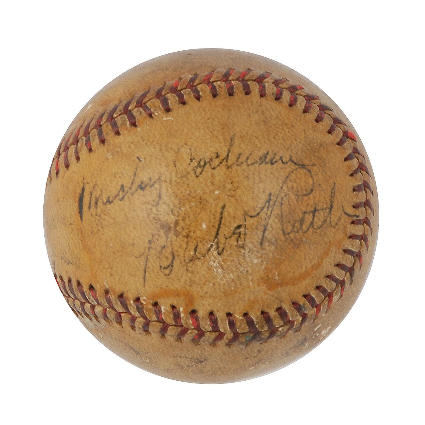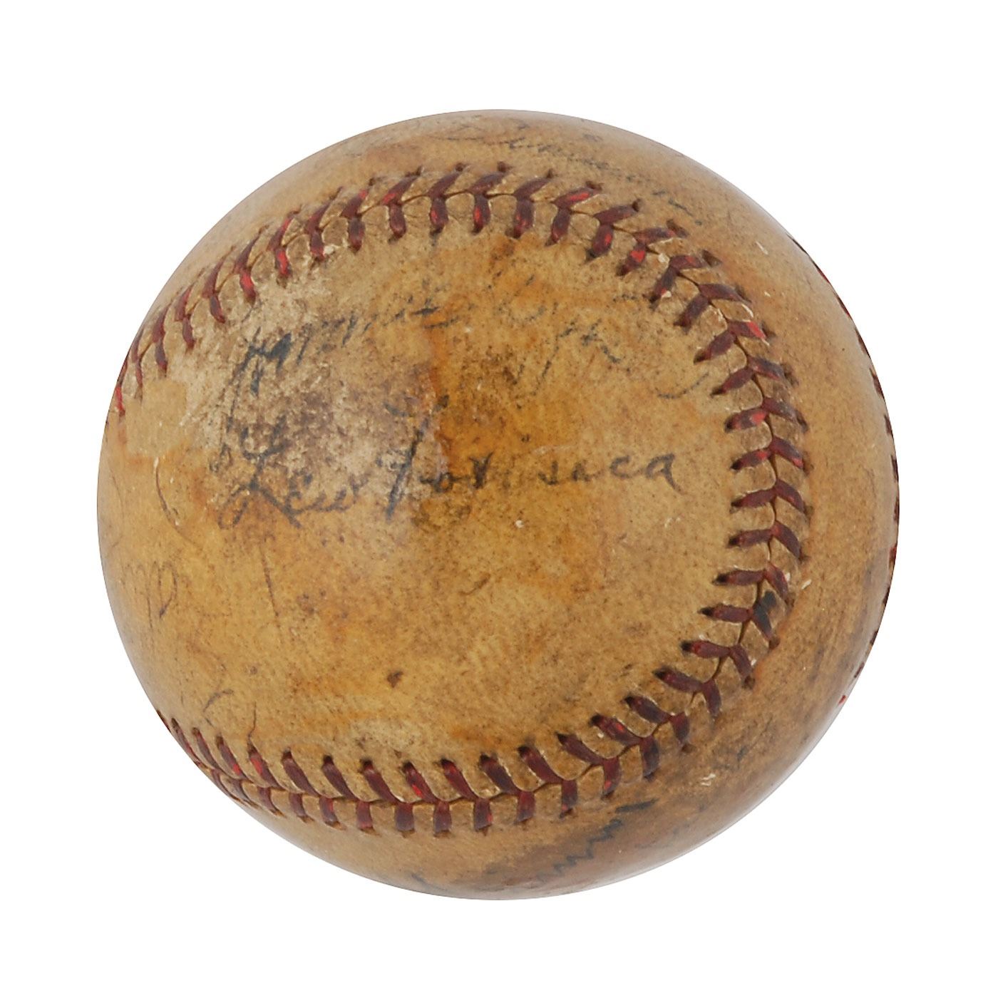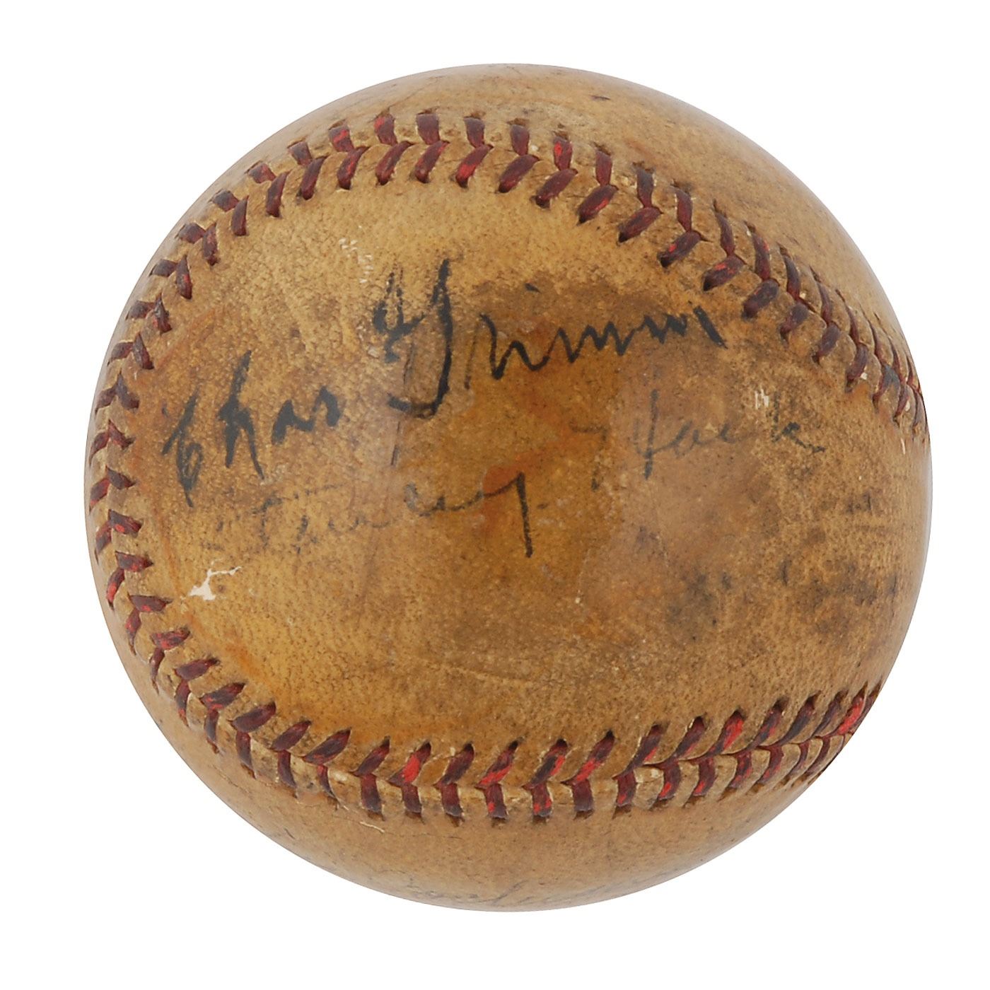 Vintage red-stitched baseball signed in fountain pen on the side panels by an assortment of 1930s stars, including "Babe Ruth," "Mickey Cochrane," "Al Simmons," "Eddie Collins," "Lew Fonseca," "Jimmie Dykes," "Chas. Grimm," "Stanley Hack," and "Frank Demaree." In very good condition, with a moderately toned coating of shellack; there may be several other signatures but they are too faded to discern. Accompanied by a full letter of authenticity from JSA.