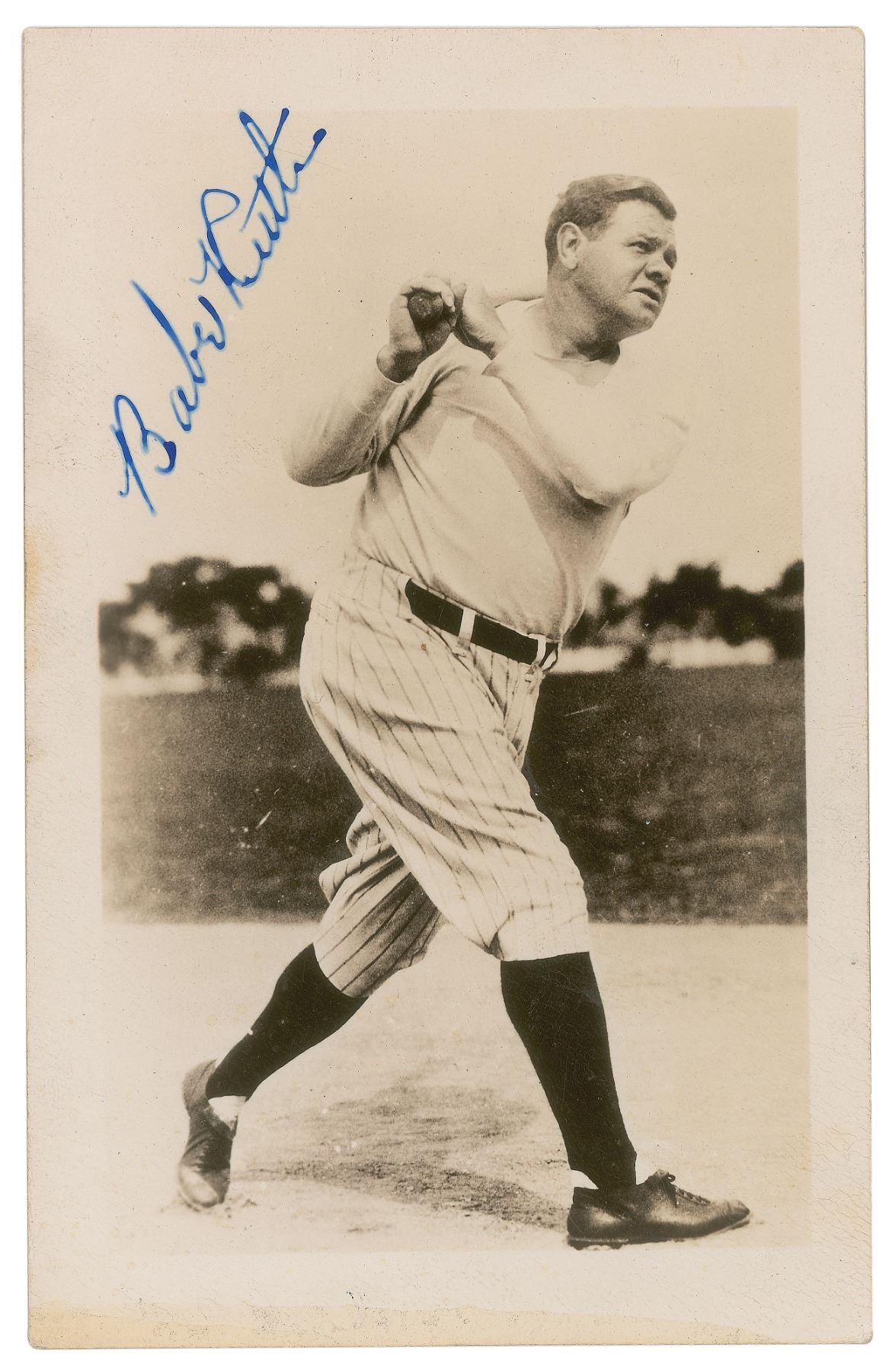 Classic vintage glossy 3.5 x 5.5 photo of Ruth taking a mighty swing while wearing his pinstriped New York Yankees pants, neatly signed in fountain pen. In fine condition.