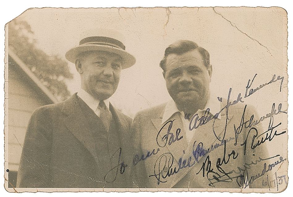 Vintage matte-finish 5.75 x 3.75 photo of Babe Ruth standing with close friend and noted New York hotelier Charles W. Schwefel, signed boldly in fountain pen, "Babe Ruth," with Schwefel signing and adding an inscription above, "To our Pal 'Atlas' Jack Kennedy." An unknown signature below Ruth's adds a date of June 17, 1931. In very good condition, with light creasing, a heavier crease to the upper right corner, a tear to the top edge, and a missing upper left corner tip. Accompanied by a full letter of authenticity from PSA/DNA.