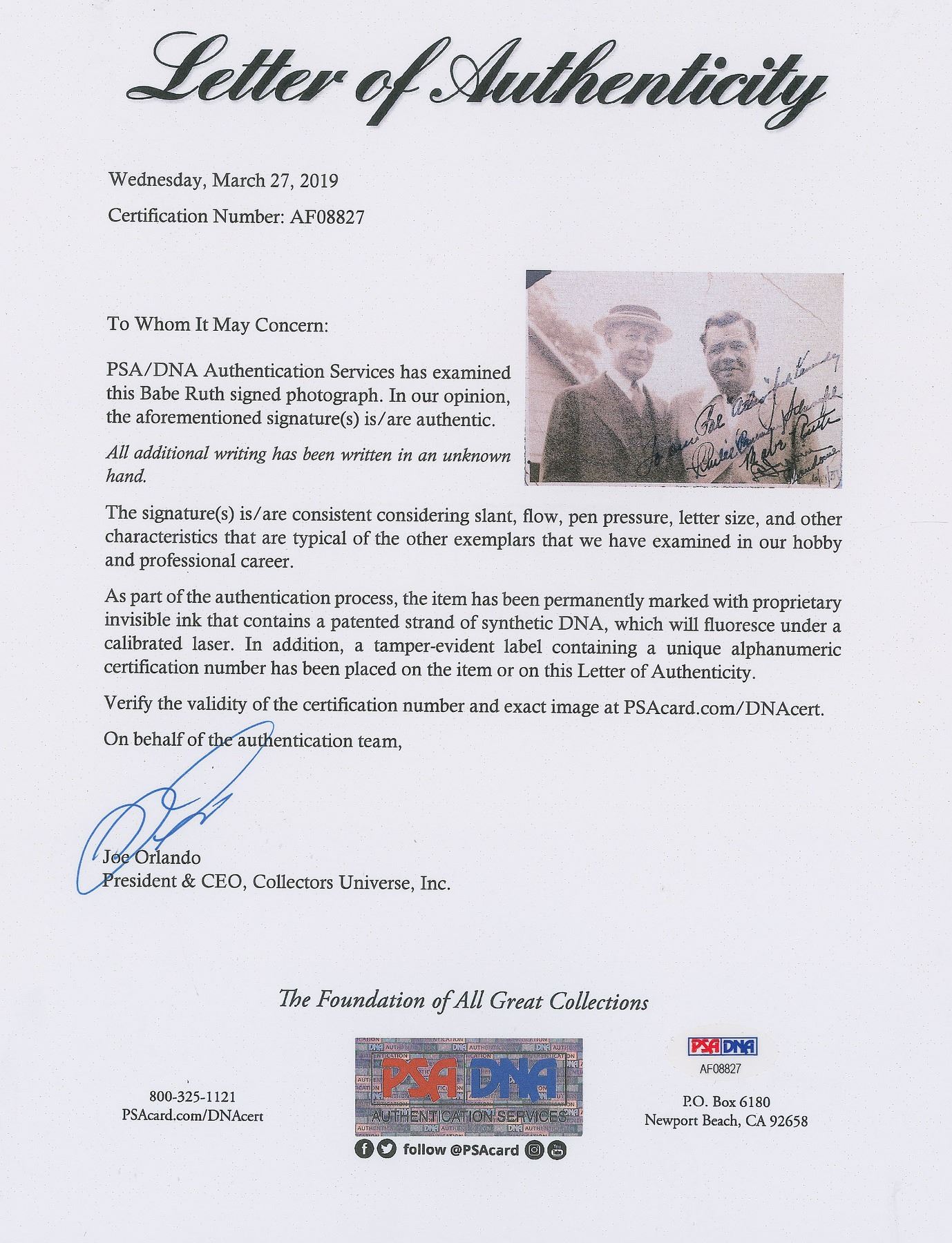 All lots sold by RR Auction are accompanied by an Auction Certificate (“AC”). On any lot presented with an AC issued by RR Auction, the certification is only as to its attribution to the person or entity described or to the lot’s usage and only as explicitly stated therein (the “Certification of Authenticity”), to the exclusion of any other warranties, express or implied, including but not limited to those pursuant to the Uniform Commercial Code. The Certification of Authenticity inures only to the original Bidder (as shown in RR Auction’s records). Bidder may not transfer, assign, or otherwise convey the Certification of Authenticity, and such purported transfer, assignment, or conveyance shall be null and void. The Certification of Authenticity is valid from date of the Auction in which Bidder was awarded the lot (the “Auction Date”) until five (5) years after the Auction Date, without exception.