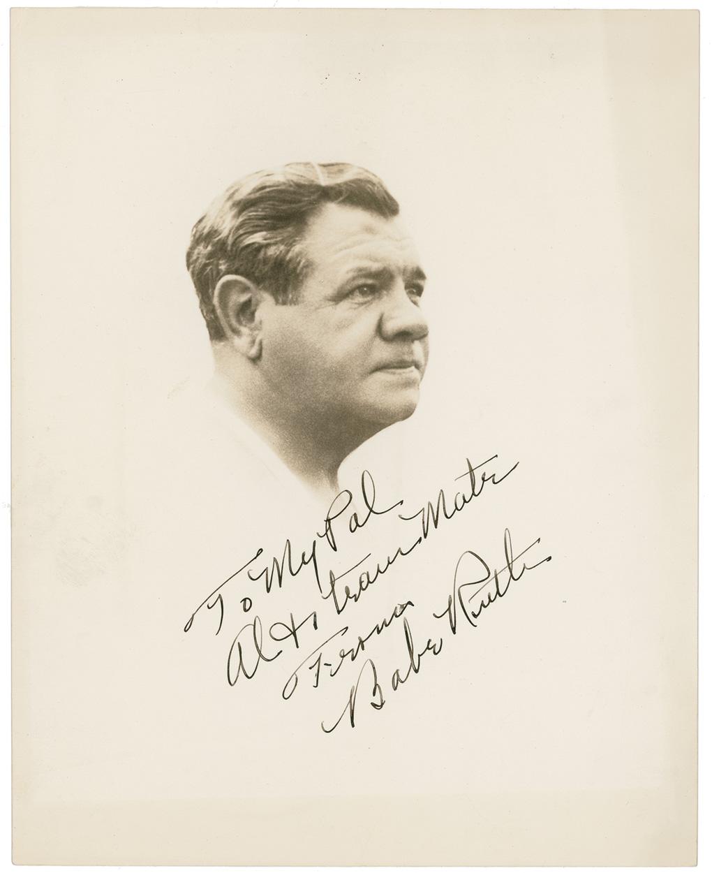 Exceptional vintage matte-finish 8 x 10 stoic bust photo, beautifully signed and inscribed in fountain pen “To my Pal Al & team mate, from Babe Ruth.” In fine condition, with a hint of mild toning to edges.