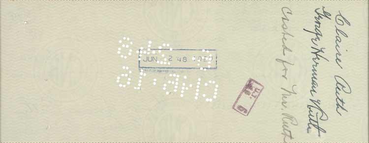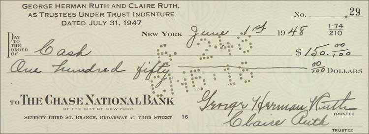 Twice signed check, 8.25 x 3.25, filled out by Claire Ruth and signed “George Herman Ruth,” and “Claire Ruth,” payable to Cash for $150.00, dated June 1, 1948. Check is also endorsed on the reverse, “George Herman Ruth,” and “Claire Ruth.” Printed lettering at top left of check reads, “George Herman Ruth and Claire Ruth, as Trustees Under Trust Indenture—Dated July 31, 1947.” This designation perhaps indicates that, as Ruth’s condition worsened, the couple sought to place some of the athlete’s assets in trust as an estate planning mechanism. Check is double matted and framed with a portrait of Ruth is his Yankee pinstripes, to an overall size of 16 x 18. In fine, crisp condition, with expected cancellation stamps and holes, none affecting any of the dark and impressive signatures. Less than two months after signing this check, Ruth would succumb to cancer on August 16, 1948. Pre-certified Steve Grad/PSA/DNA and RRAuction COA.