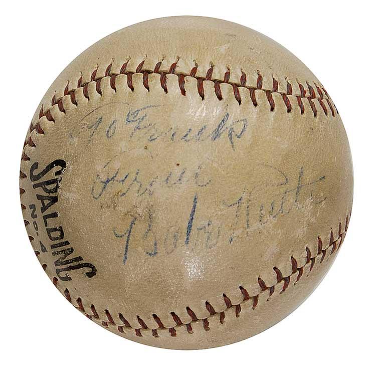 Official Spalding Match Ball baseball signed and inscribed on a side panel in fountain pen, “To Frank from Babe Ruth.” In very good condition, with even overall toning to ball, Ruth’s signature and inscription several shades light, but legible, and scattered light scuffs and surface marks to ball. Pre-certified Steve Grad/PSA/DNA and RRAuction COA.