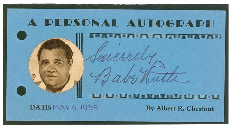 Bold vintage fountain pen signature, “Sincerely, Babe Ruth,” on a 5.5 x 2.75 blue card from the Albert R. Chestnut collection, dated in another hand May 4, 1935. In fine condition, attached to a slightly larger black card, with a small photo attached to the left blank area and tiny smudge to the bottom of the “B” in “Babe.” From his Pennsylvania home, Chestnut, a printer by profession, began collecting autographs in 1935. He sent these personally-printed cards to over a thousand celebrities and received favorable replies from the vast majority, finally retiring from collecting to raise his family when postage increased from 2¢ per card! Pre-certified Steve Grad/PSA/DNA and RRAuction COA.