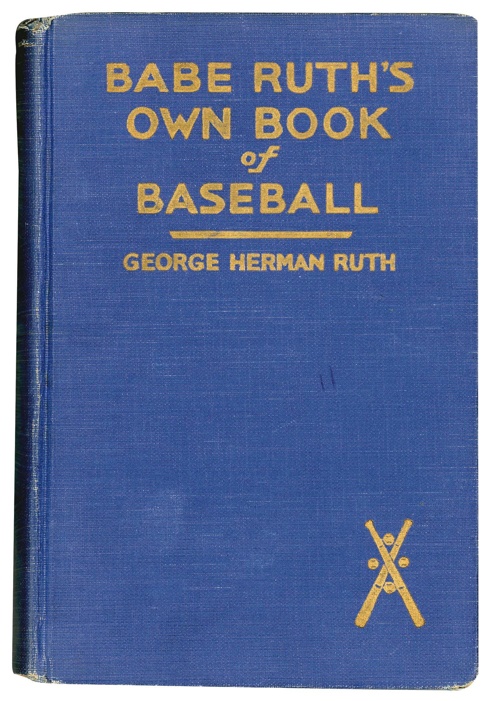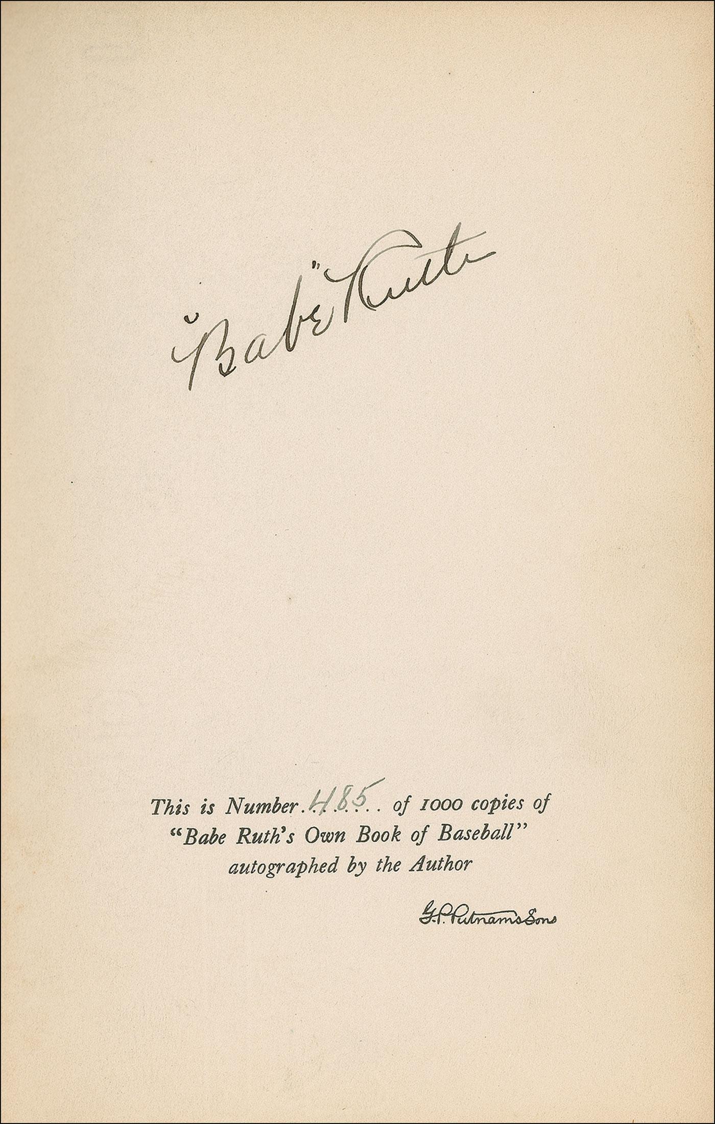 Signed book: Babe Ruth’s Own Book of Baseball. Limited first edition, first printing. NY: G. P. Putnam’s Sons, 1929. Hardcover, 5.5 x 8.25, 301 pages. Signed on the limitations page in fountain pen, “’Babe’ Ruth,” indicating that this is a limited edition of 1000 copies (this being number 485). In very good condition, with gift inscription in another hand to first free end page, weak and partially separated front hinge, two date stamps to inside back cover, sunning and small separation to spine, and scattered light wear to covers and their edges. A classic early Ruth coming off the greatest 2 seasons ever played 1927 - 1928. Pre-certified Steve Grad/PSA/DNA and RRAuction COA.